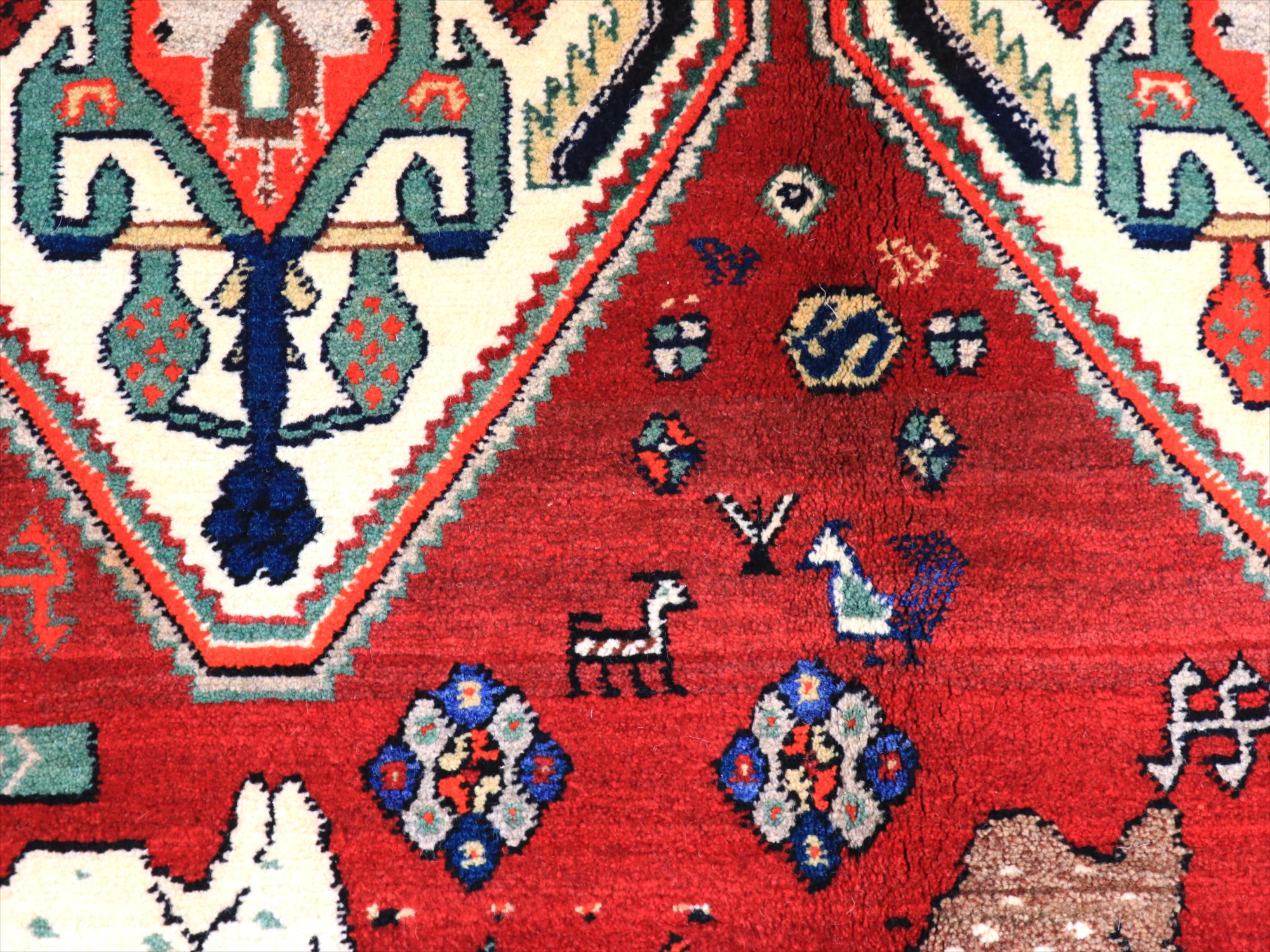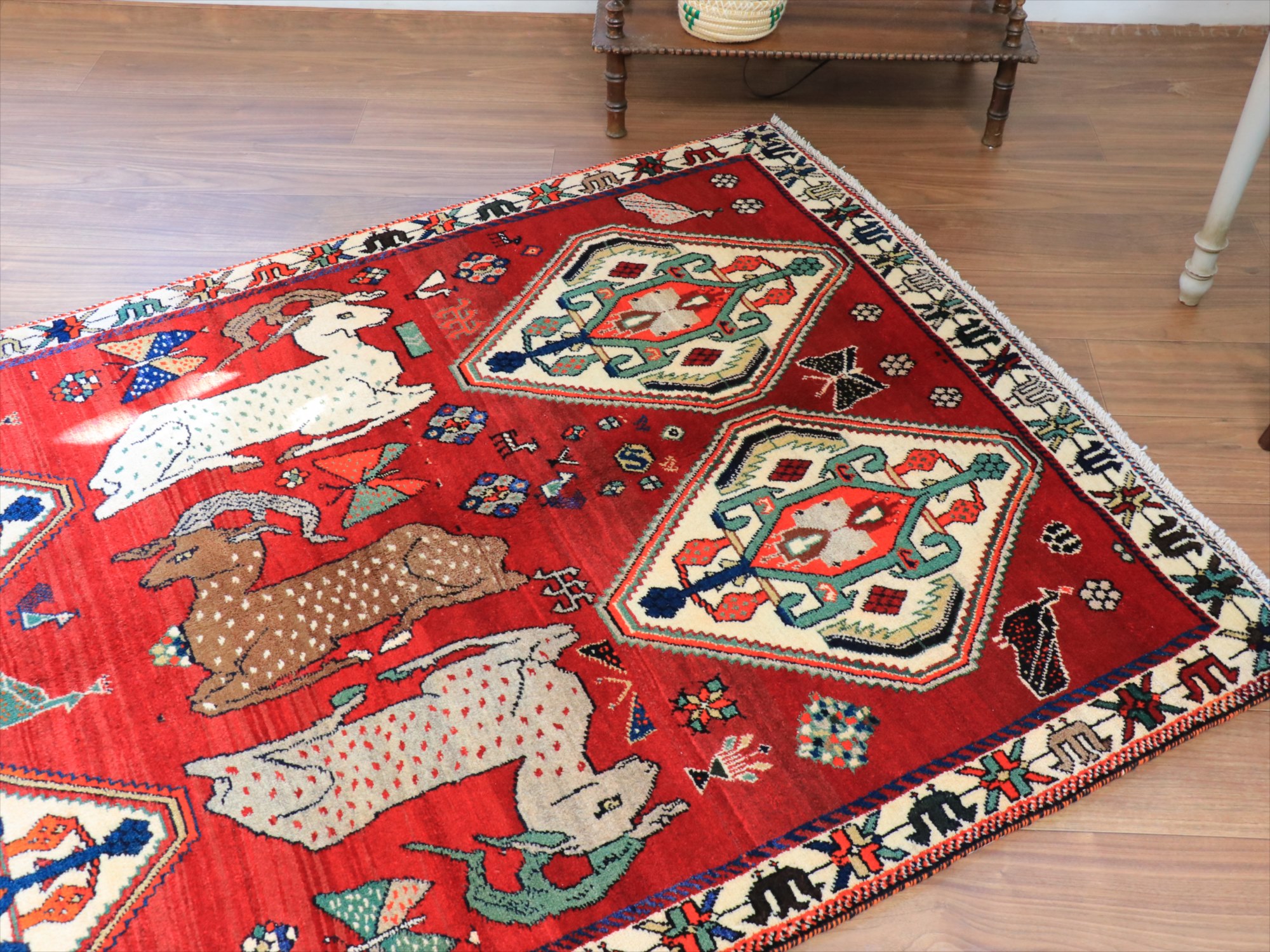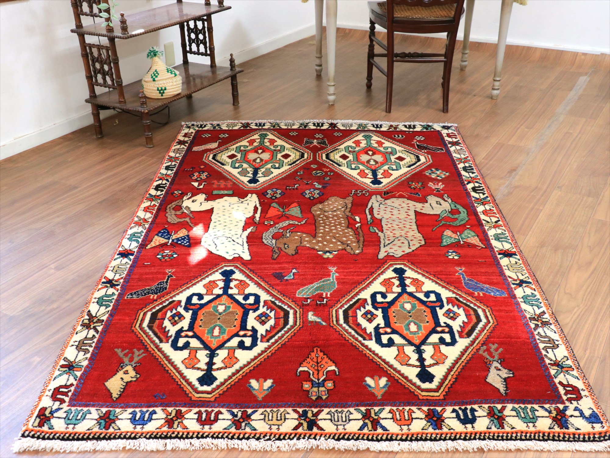 立派な角を持つ牡鹿が優雅に座ってくつろいでいる様子が織り込まれています。鹿は家畜ではありませんが、森の中から親子仲良く現れる鹿は、家庭円満の象徴とも言われ、カシュカイ族のラグにはたびたび登場するモチーフです。上下には、スカラベのようなモチーフのひし形のメダリオンが4つ並んでいて、ラグとしてはとてもユニークな配置の一枚。