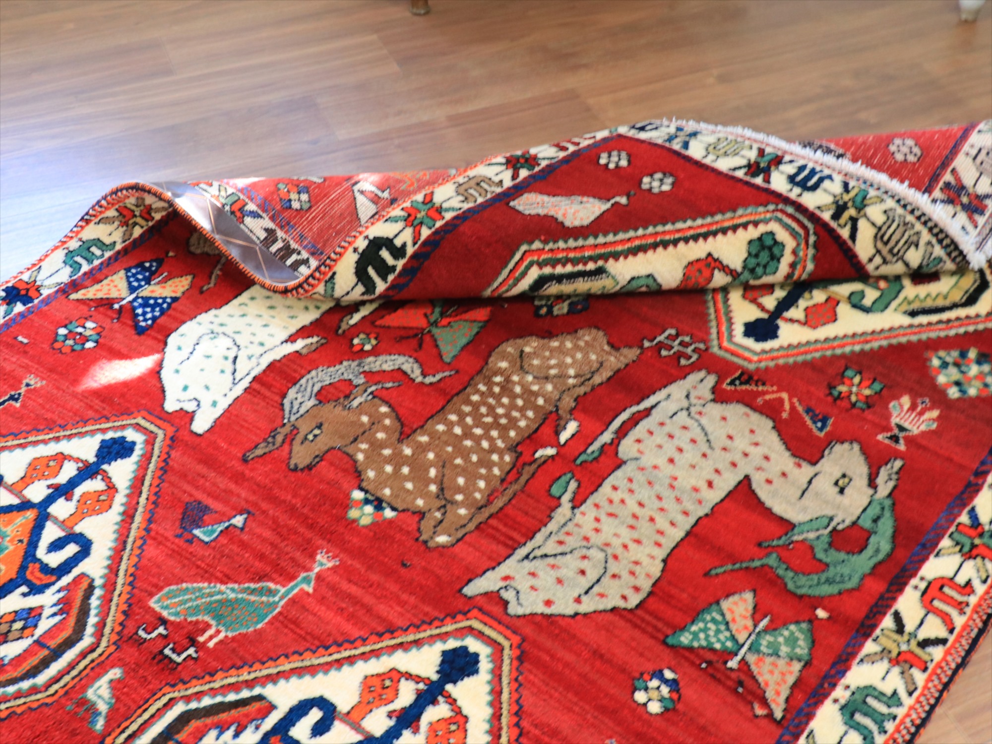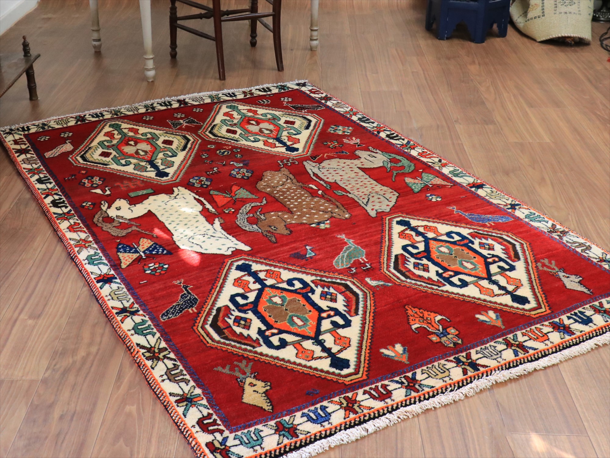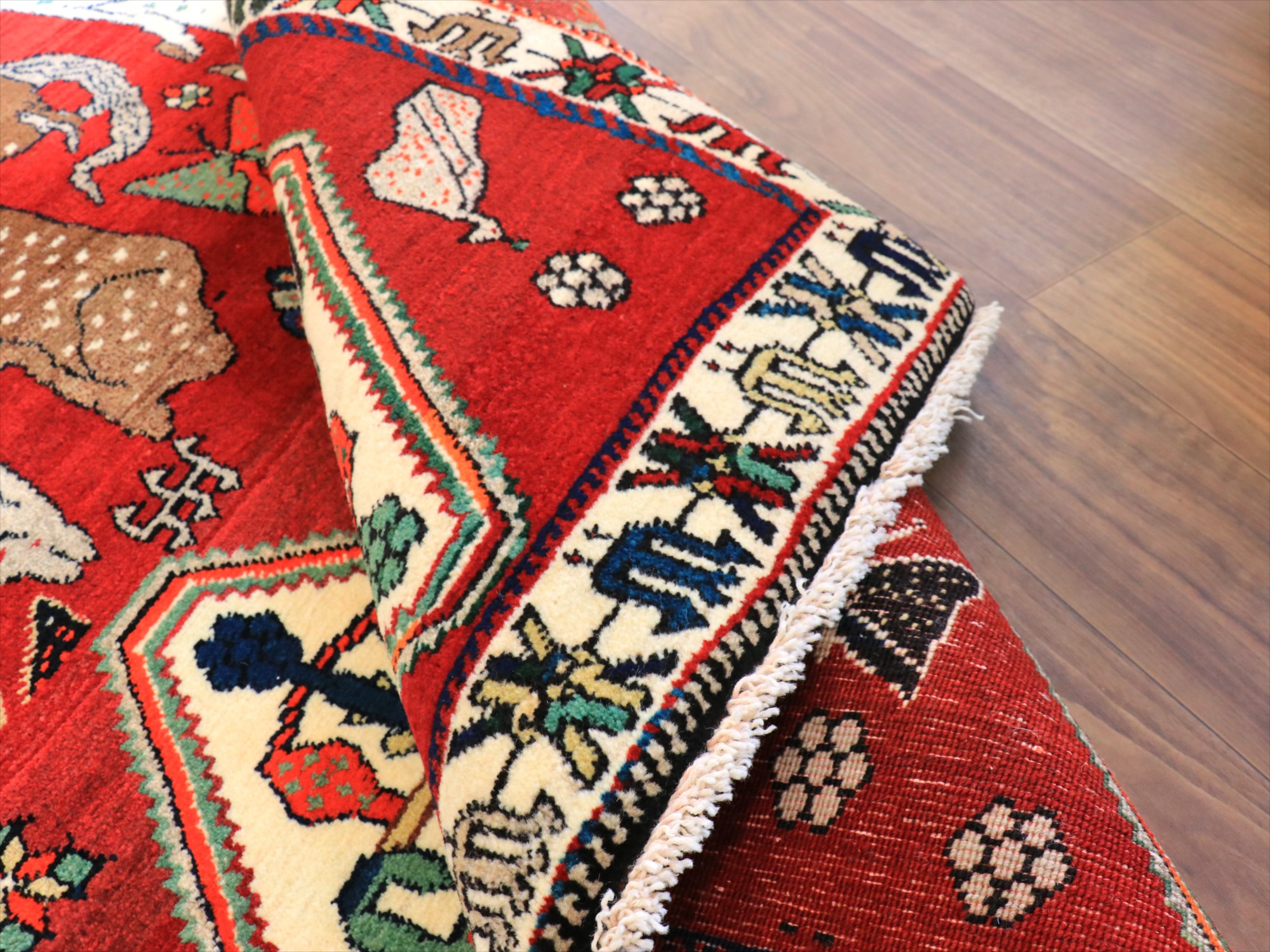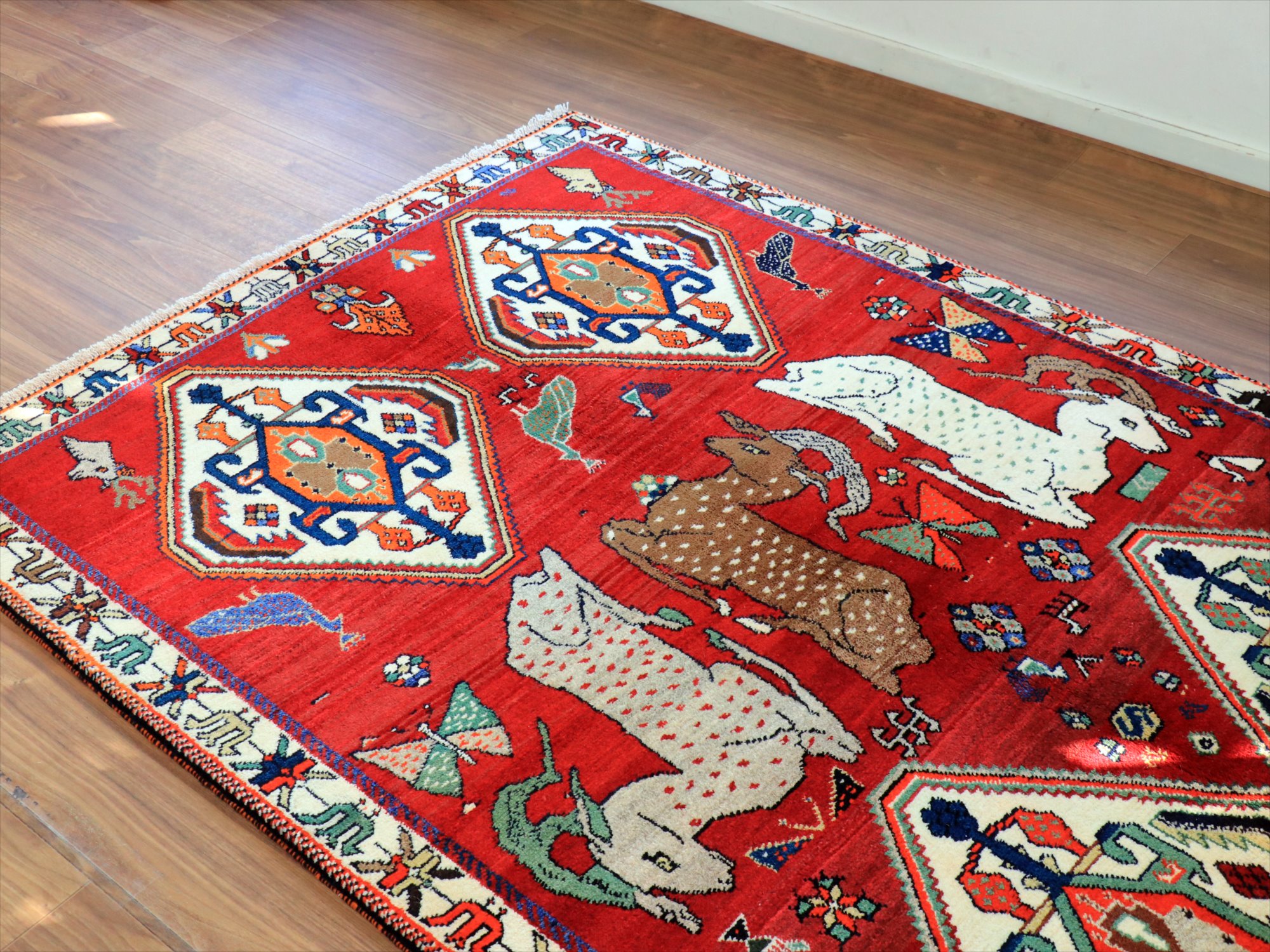 立派な角を持つ牡鹿が優雅に座ってくつろいでいる様子が織り込まれています。鹿は家畜ではありませんが、森の中から親子仲良く現れる鹿は、家庭円満の象徴とも言われ、カシュカイ族のラグにはたびたび登場するモチーフです。上下には、スカラベのようなモチーフのひし形のメダリオンが4つ並んでいて、ラグとしてはとてもユニークな配置の一枚。