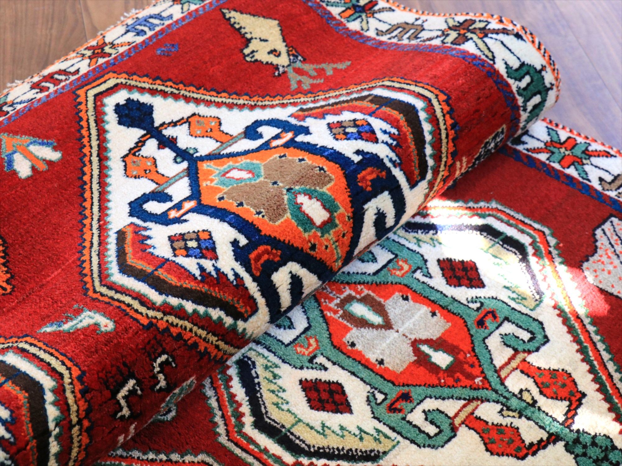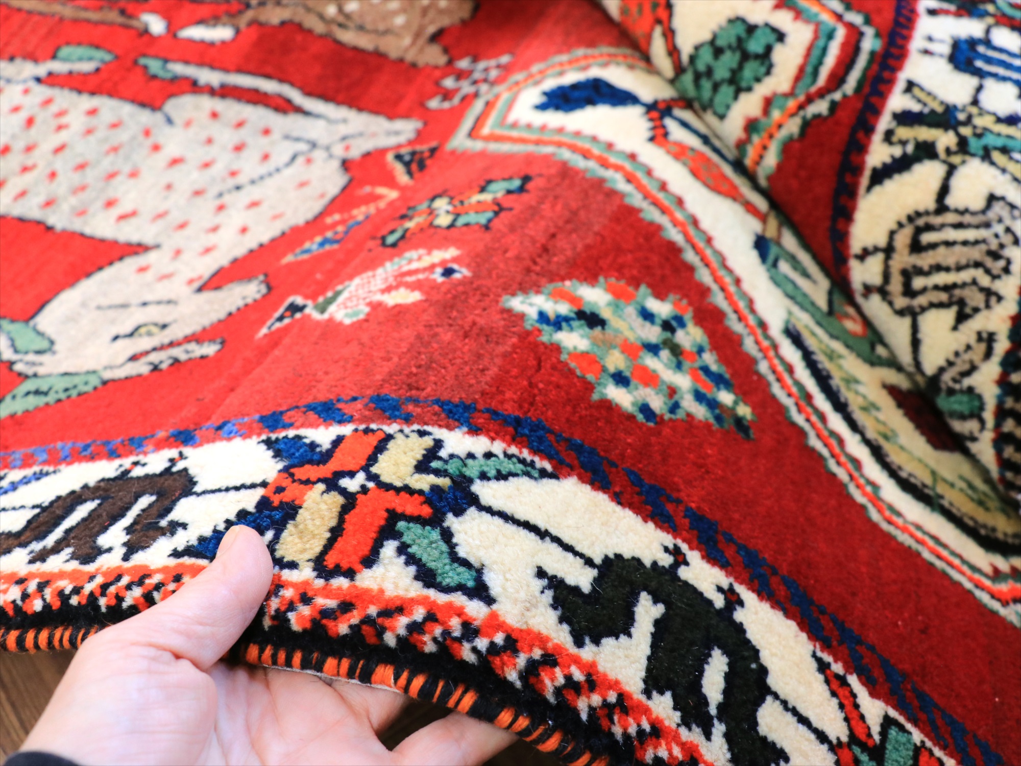 テントの中で使うために織られたオールドギャッベですが、実際には使わずに大切に保管されていたもので、まるで織ったばかりのようにきれいな状態です。パイル(毛足)はふっくらとしていて、ラグ全体の厚みは1.3-1.4cm程度。