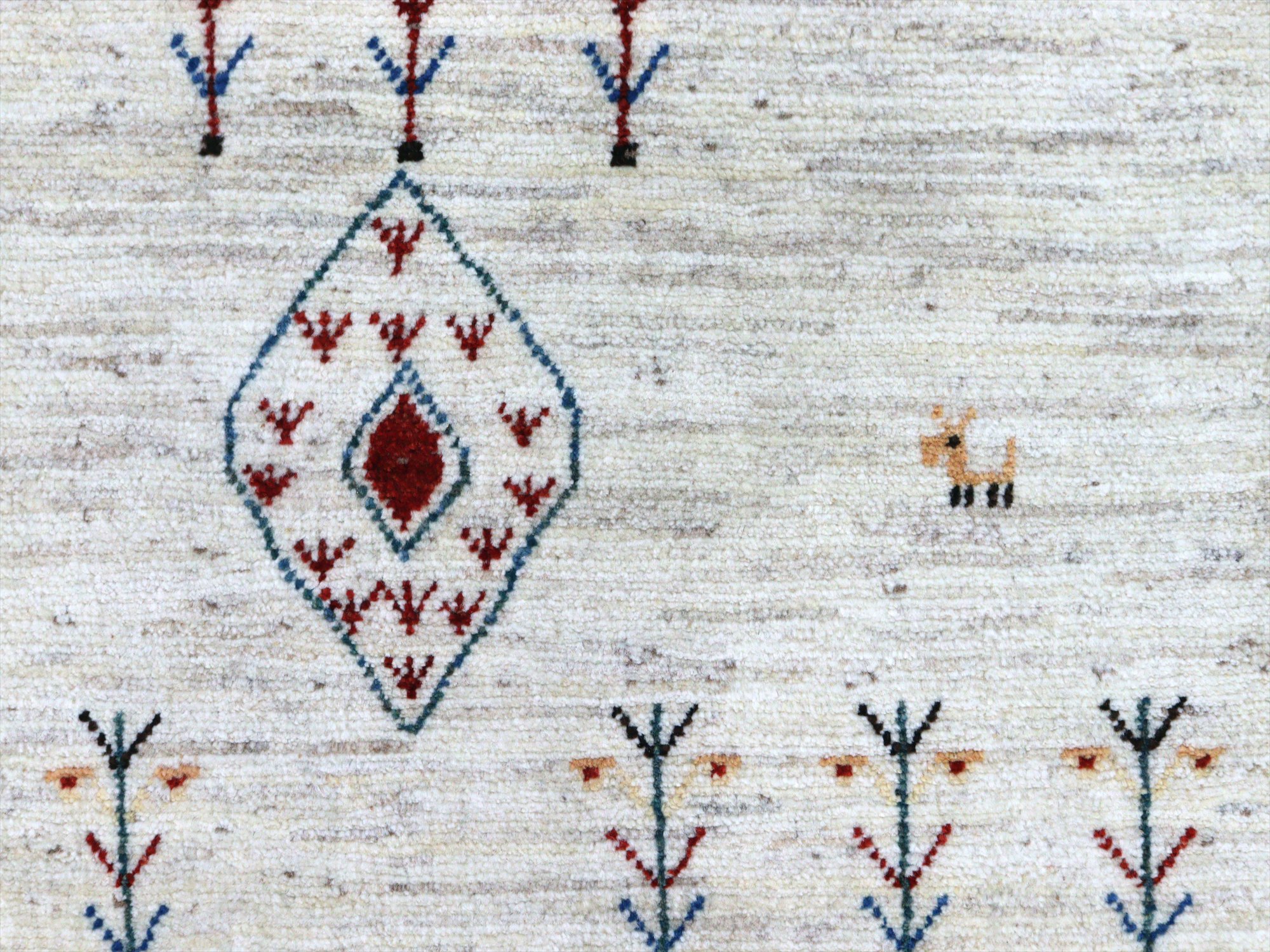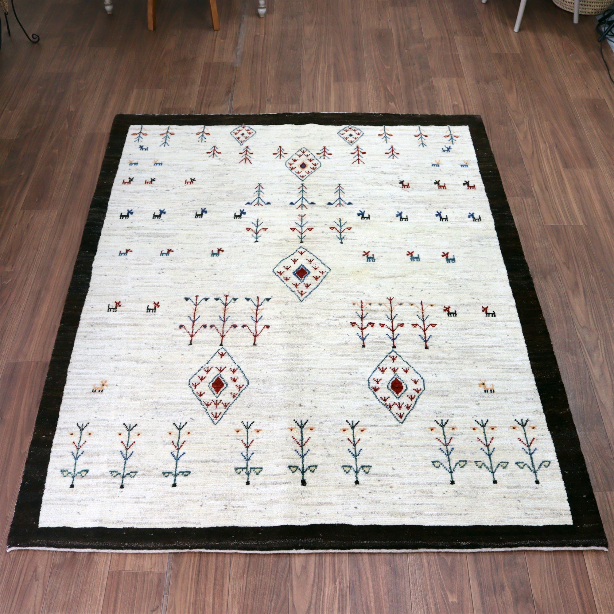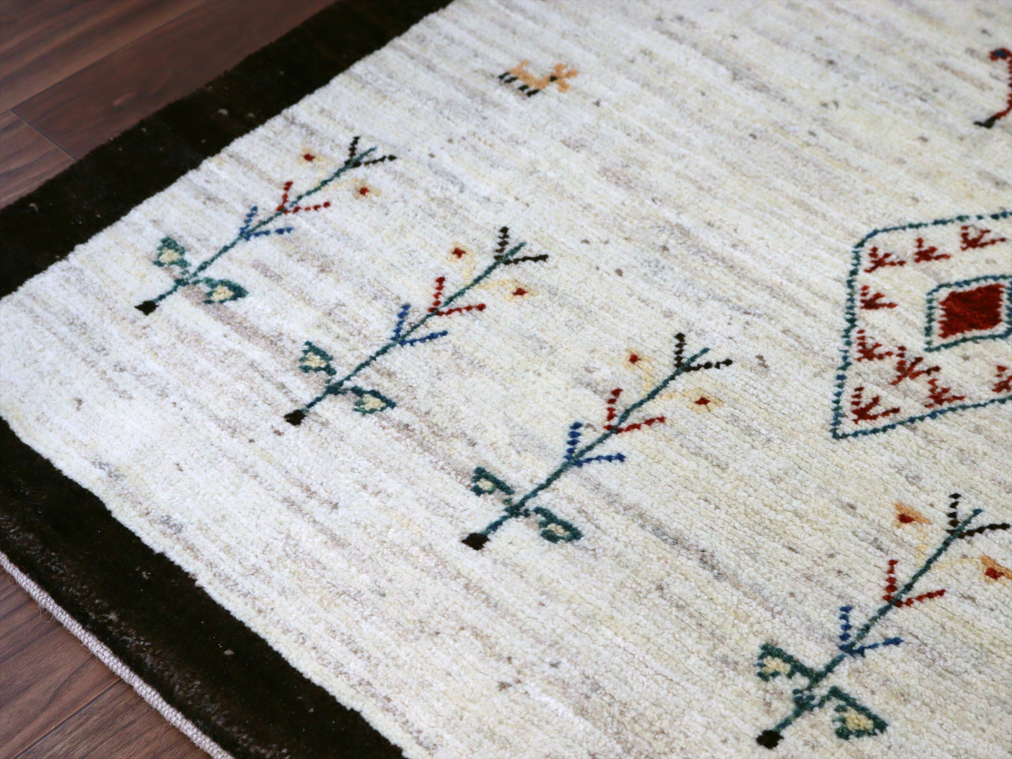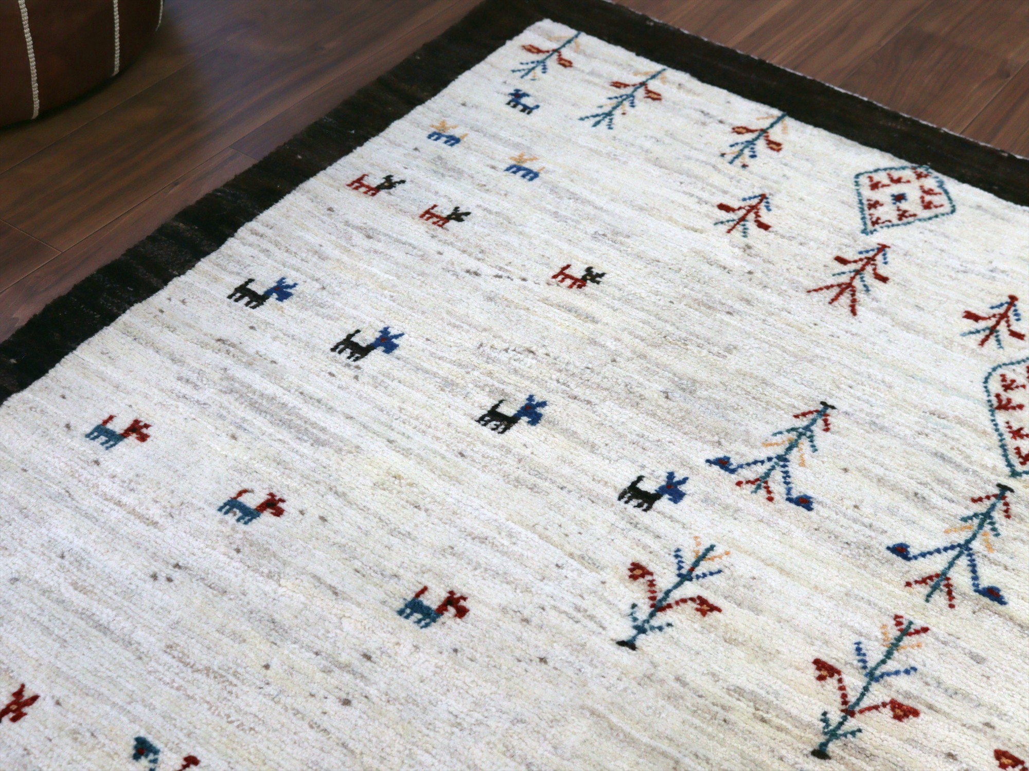 染めていない羊毛ベースに、生命の木、菱形文様、そして羊たちが織り込まれた、素朴な雰囲気のギャッベ。まるで遊牧民の村の風景を絵本のように表現した1枚です。