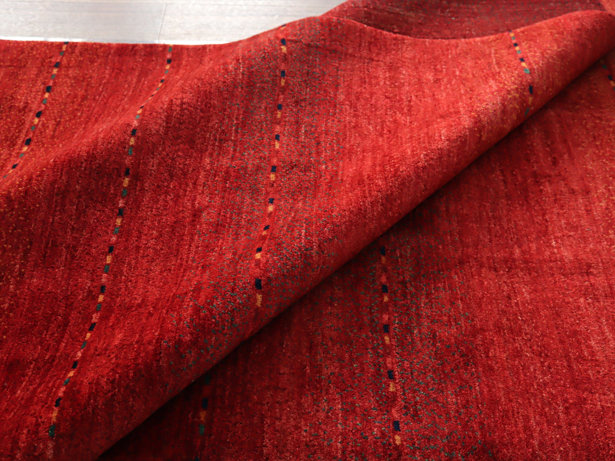 濃淡のあるレッドが繊細に表現された、シンプルなボーダーデザインのギャッベ。深みのある赤からやや明るい朱色へと移ろう、自然なグラデーションが一面に広がり、力強さと温もりを感じさせます。さりげなく織り込まれた小さな色糸により、ボーダーが成されシンプルながらもアクセントの効いた1枚に。