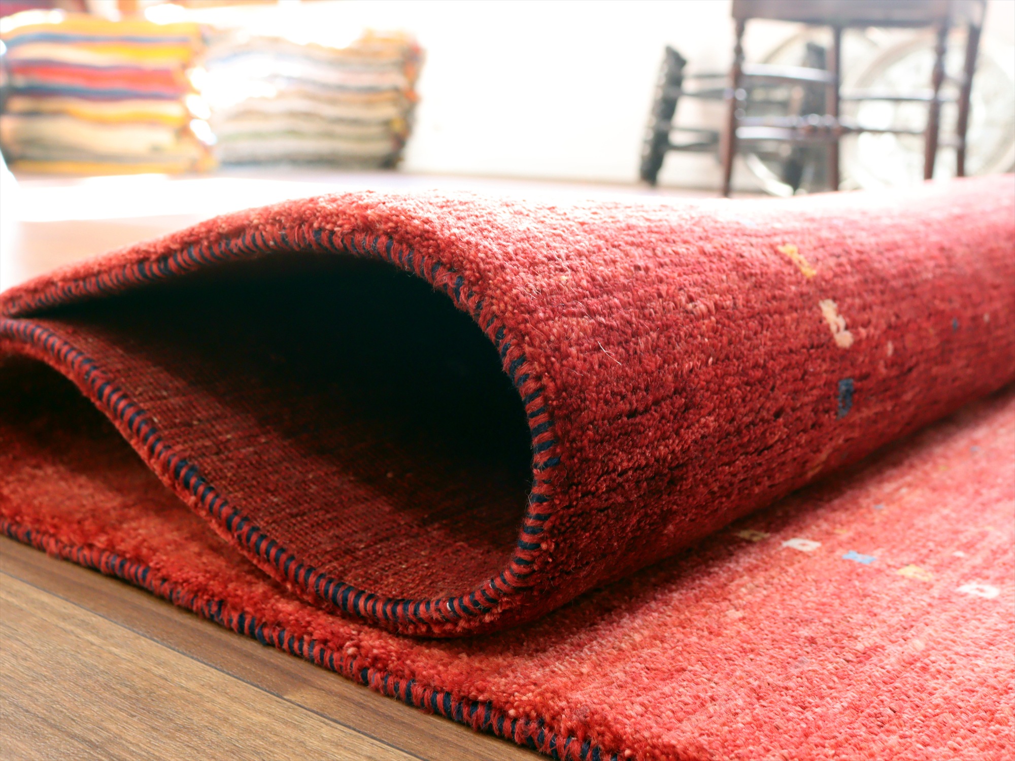 特に仕上げの行程は丁寧で、上下の縦糸をキリムを織り足して巻き込んでからロックしていたり、クシで丁寧にかき出してあるため遊び毛もほとんど出てこないなど、とても手のかかった仕上げです。