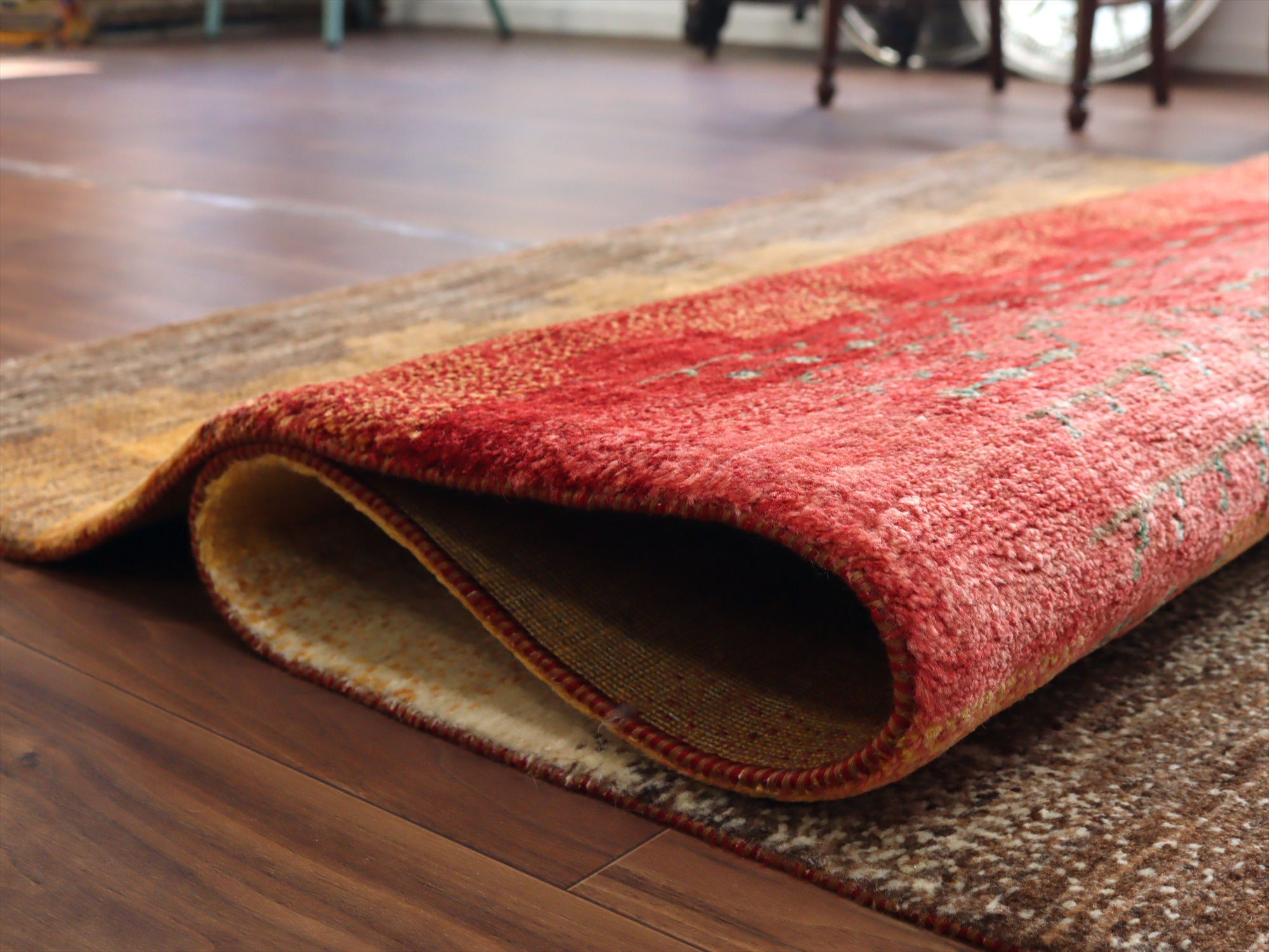 上下の縦糸を巻き込んでいます。ベースを含めたラグの厚みは、1.3cm程でパイルはすっきりとしていてモチーフがきれいに表現されています。