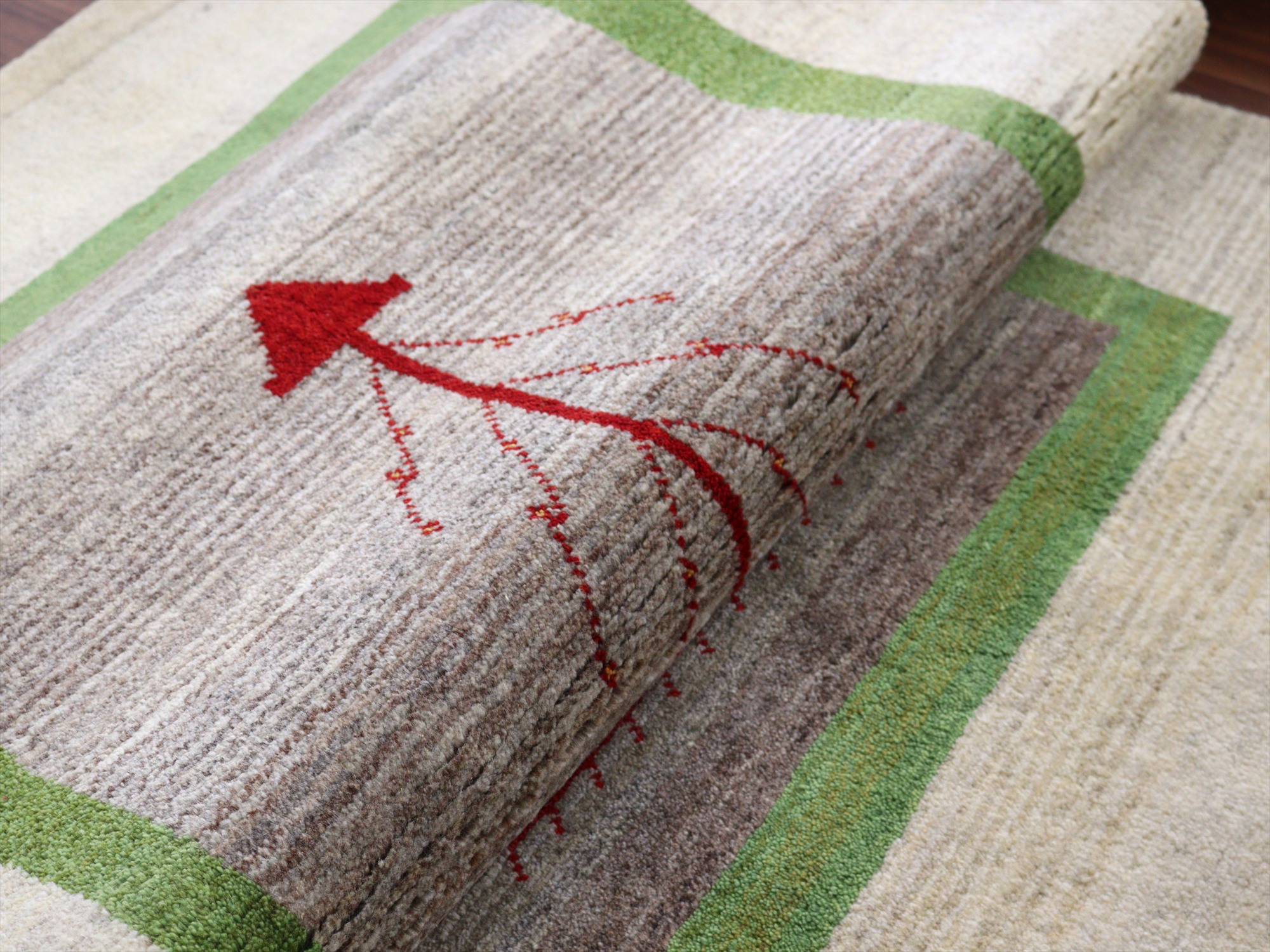 外側にアイボリー、手で描いたようなグリーンのフレームの内側には、グレーのグラデーションに赤い色糸で生命の樹が織り込まれています。手織りらしさを感じられる素朴な雰囲気のギャッベです。