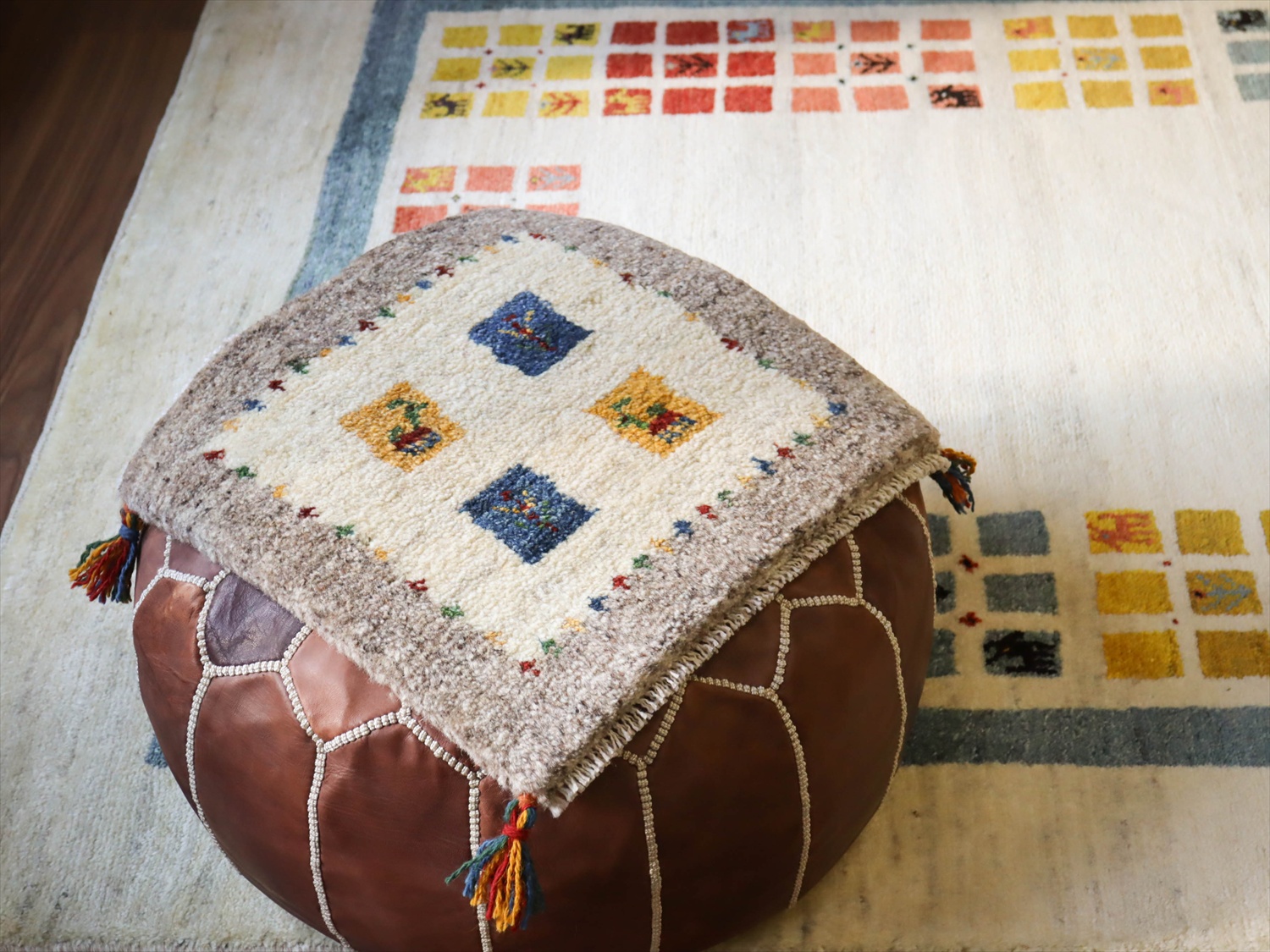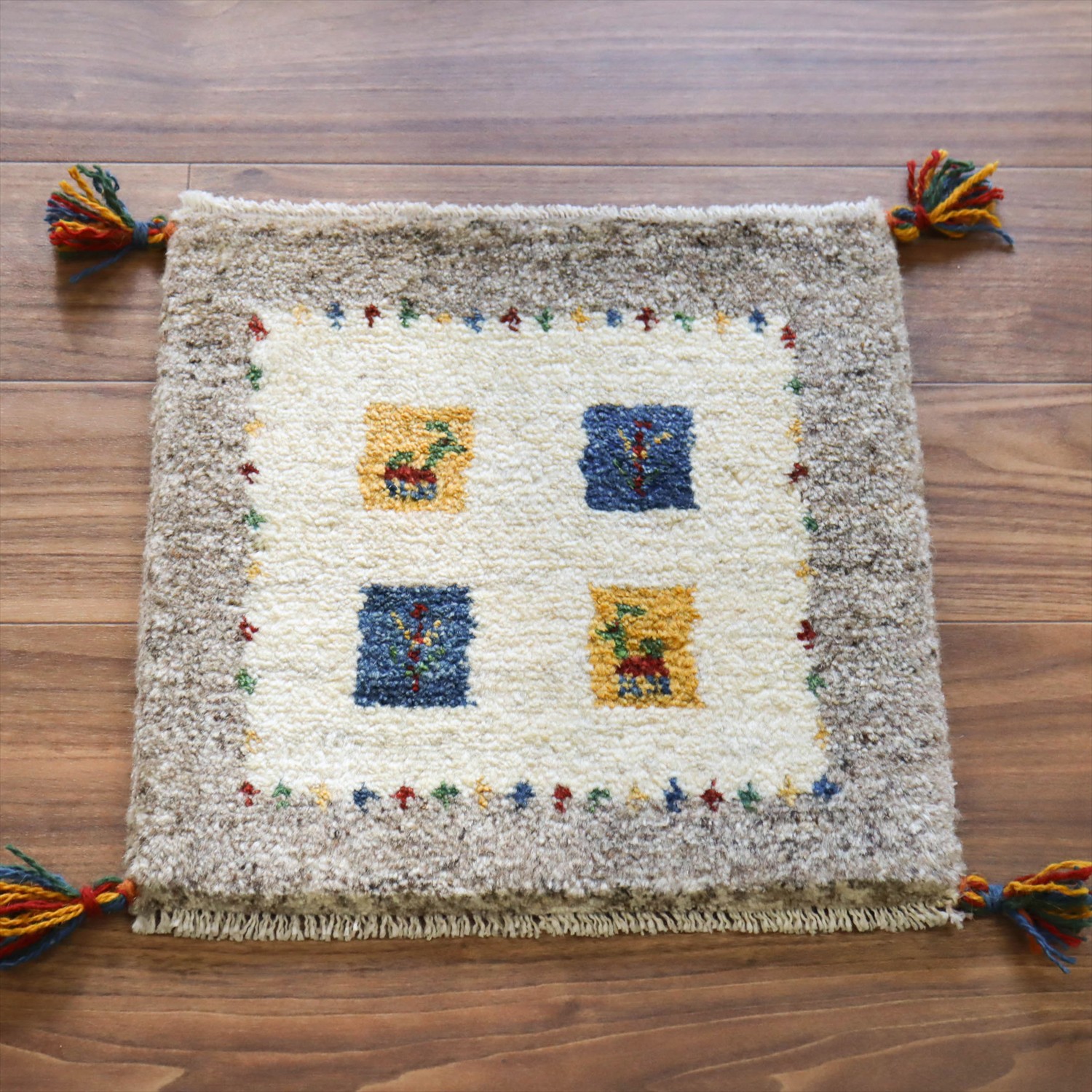 ギャッベ イラン産手織り 座布団サイズ 42x42cm ナチュラルアイボリー グレー
