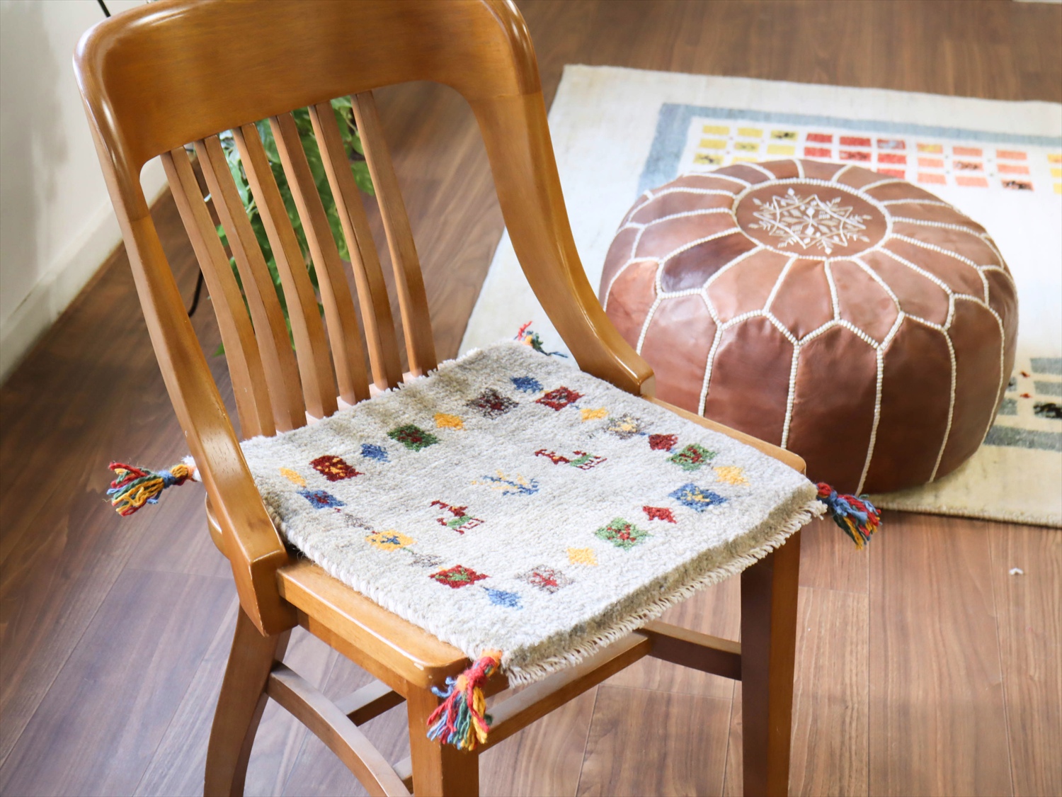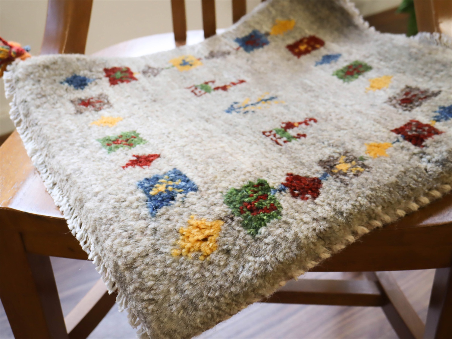 ギャッベ イラン産手織り 座布団サイズ 42x40cm ライトグレー カラフルなモチーフ
