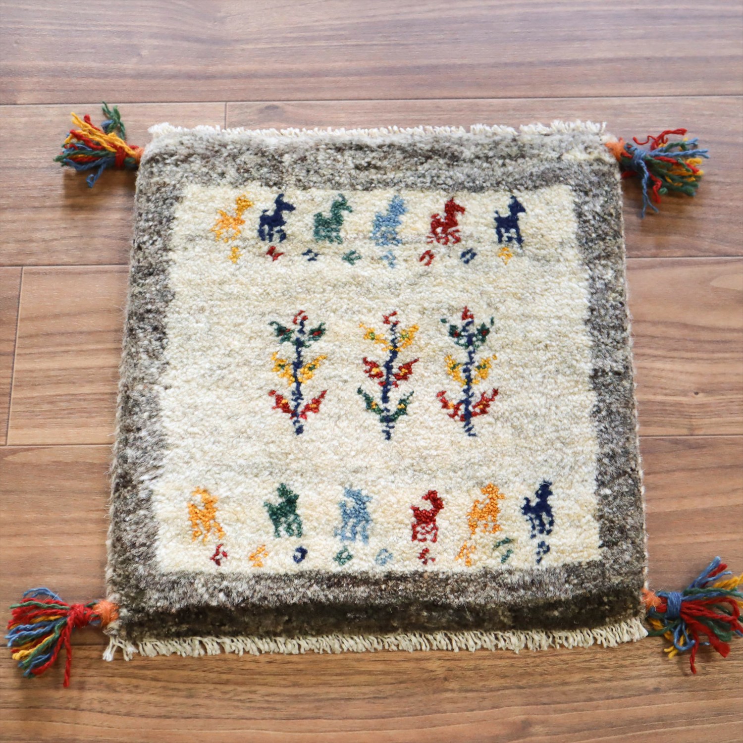 ギャッベ イラン産手織り 座布団サイズ 41x38cm ナチュラルアイボリー/グレー