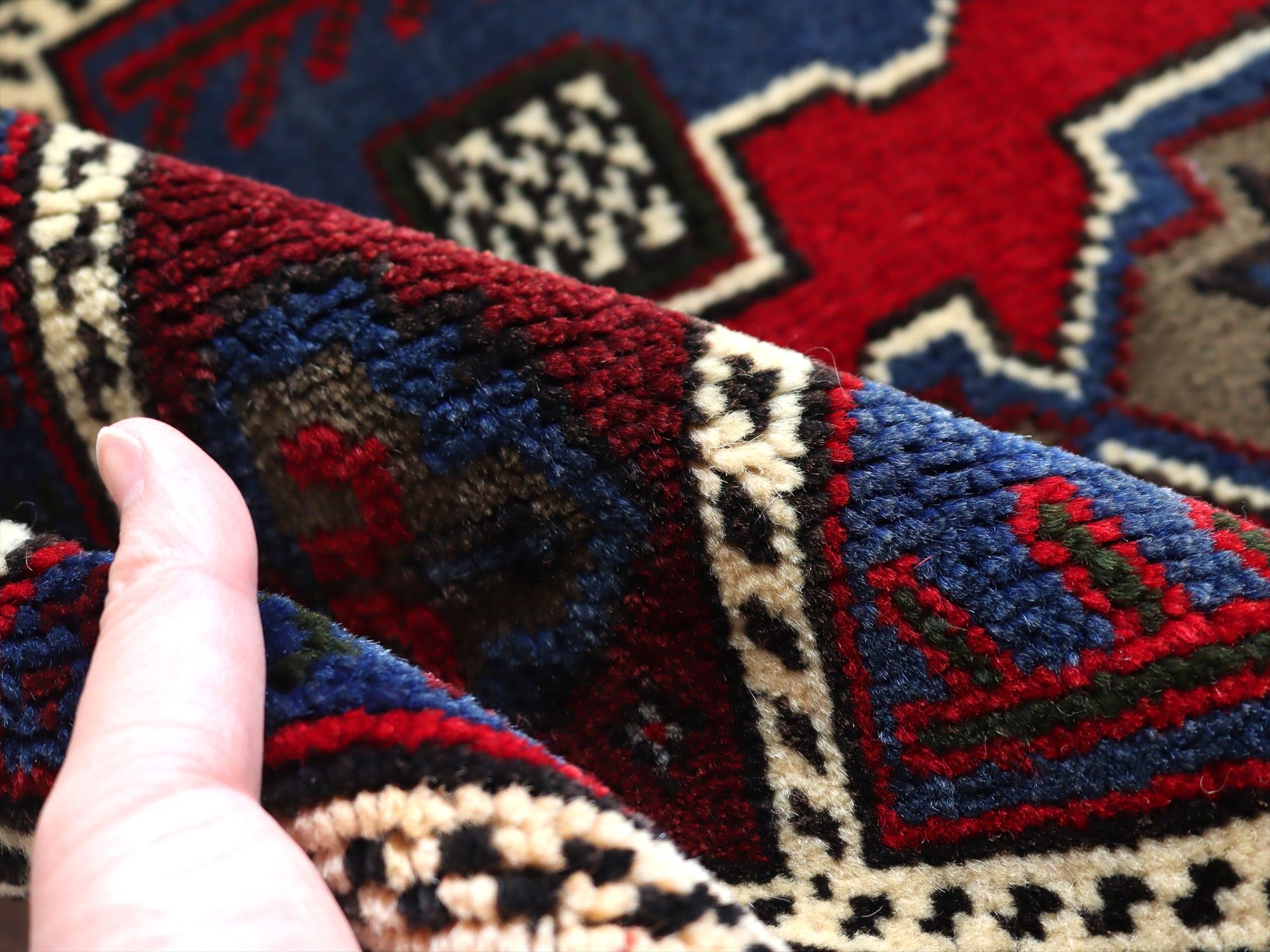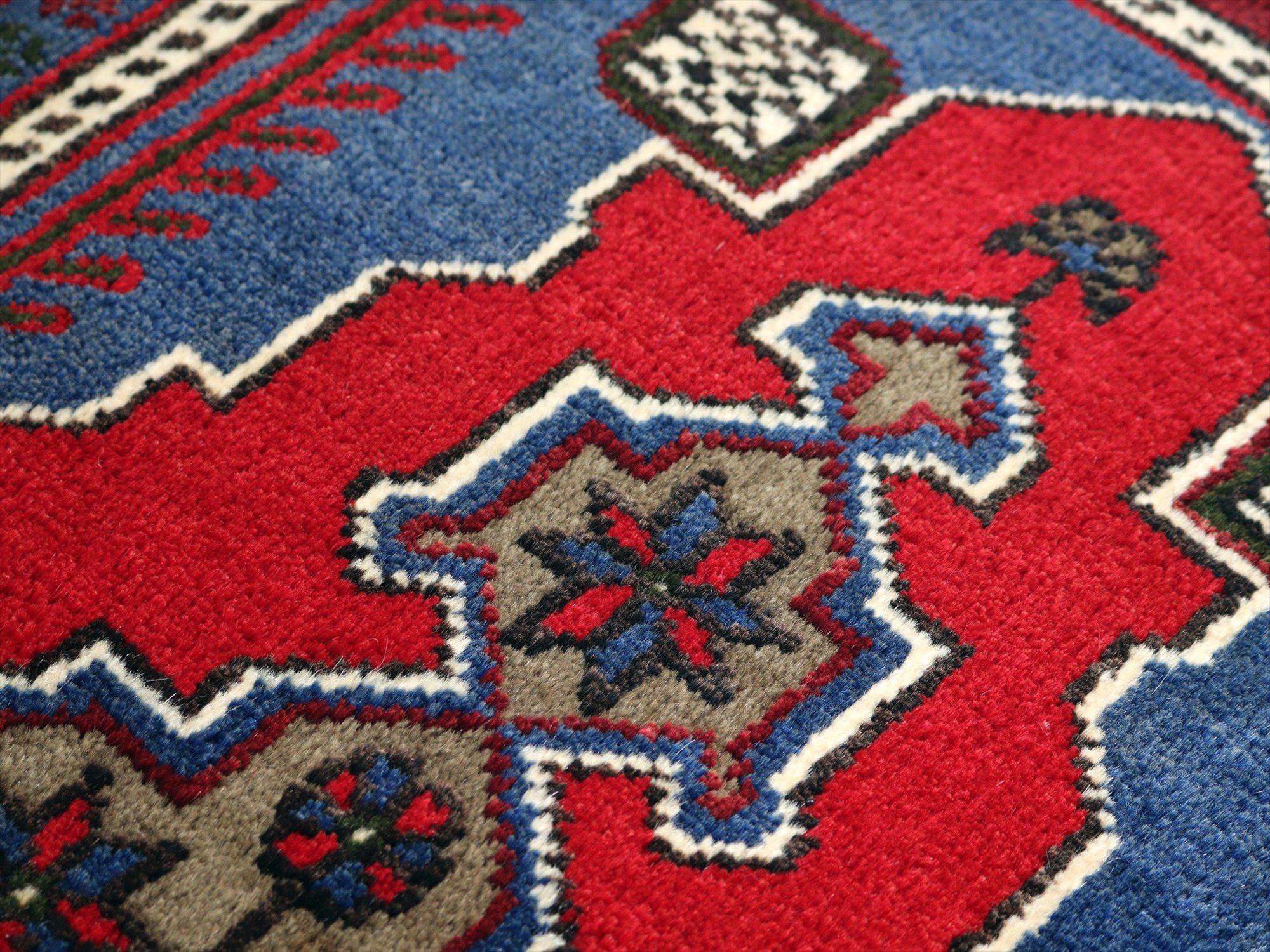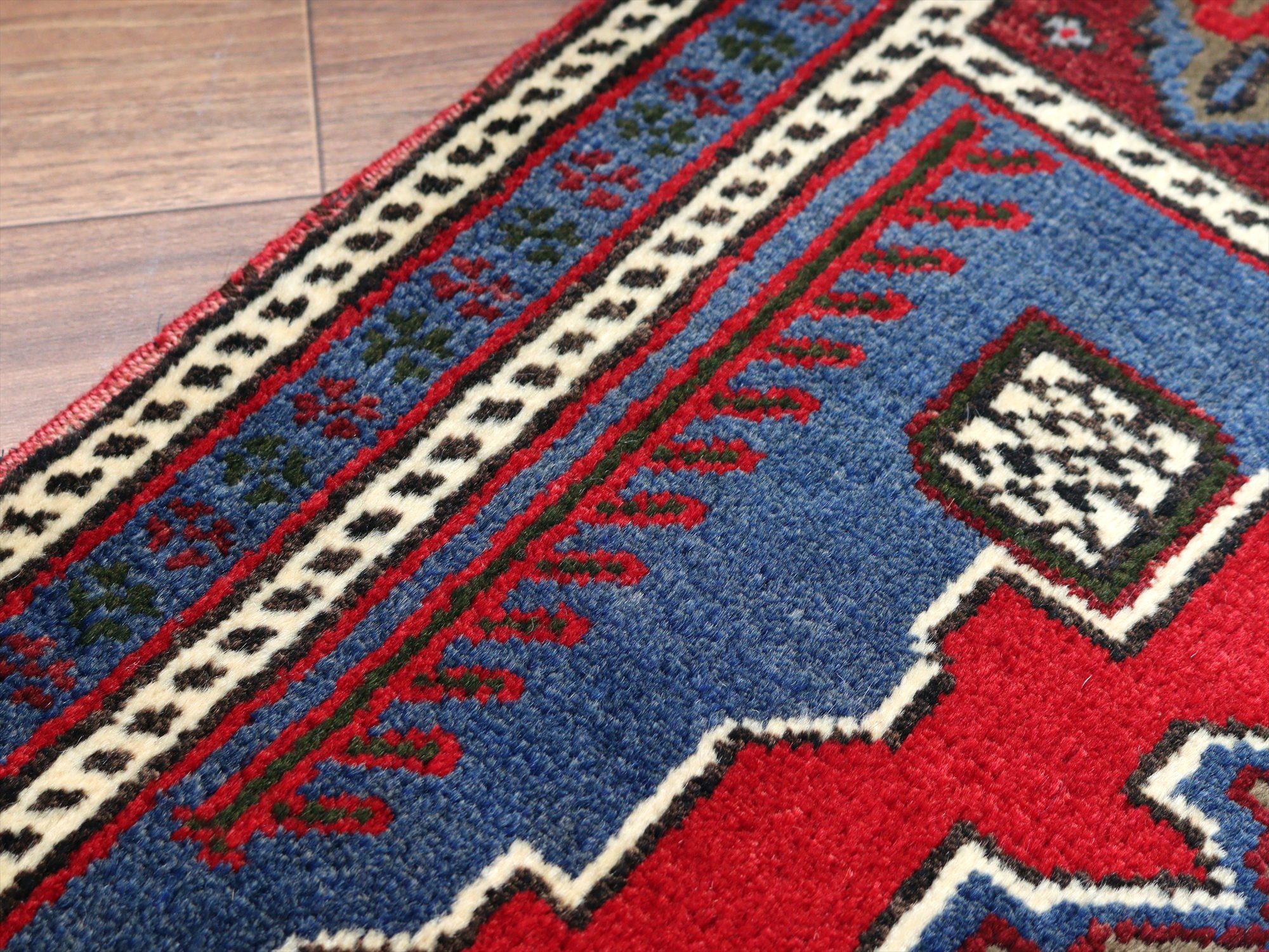 発色の良いレッドとブルーのコンビネーションで六角メダリオンがデザインされた、やや細長いサイズのじゅうたんです。