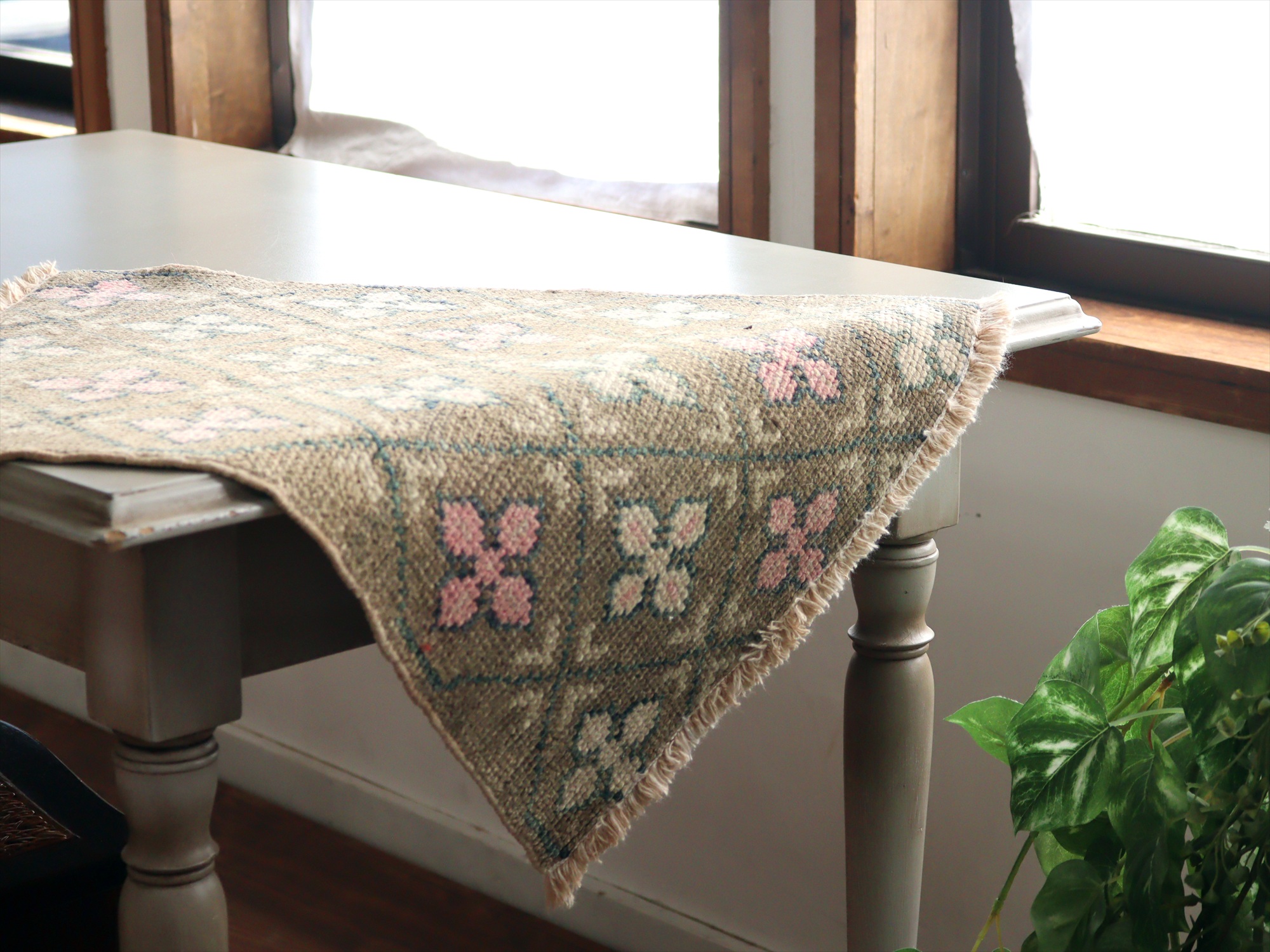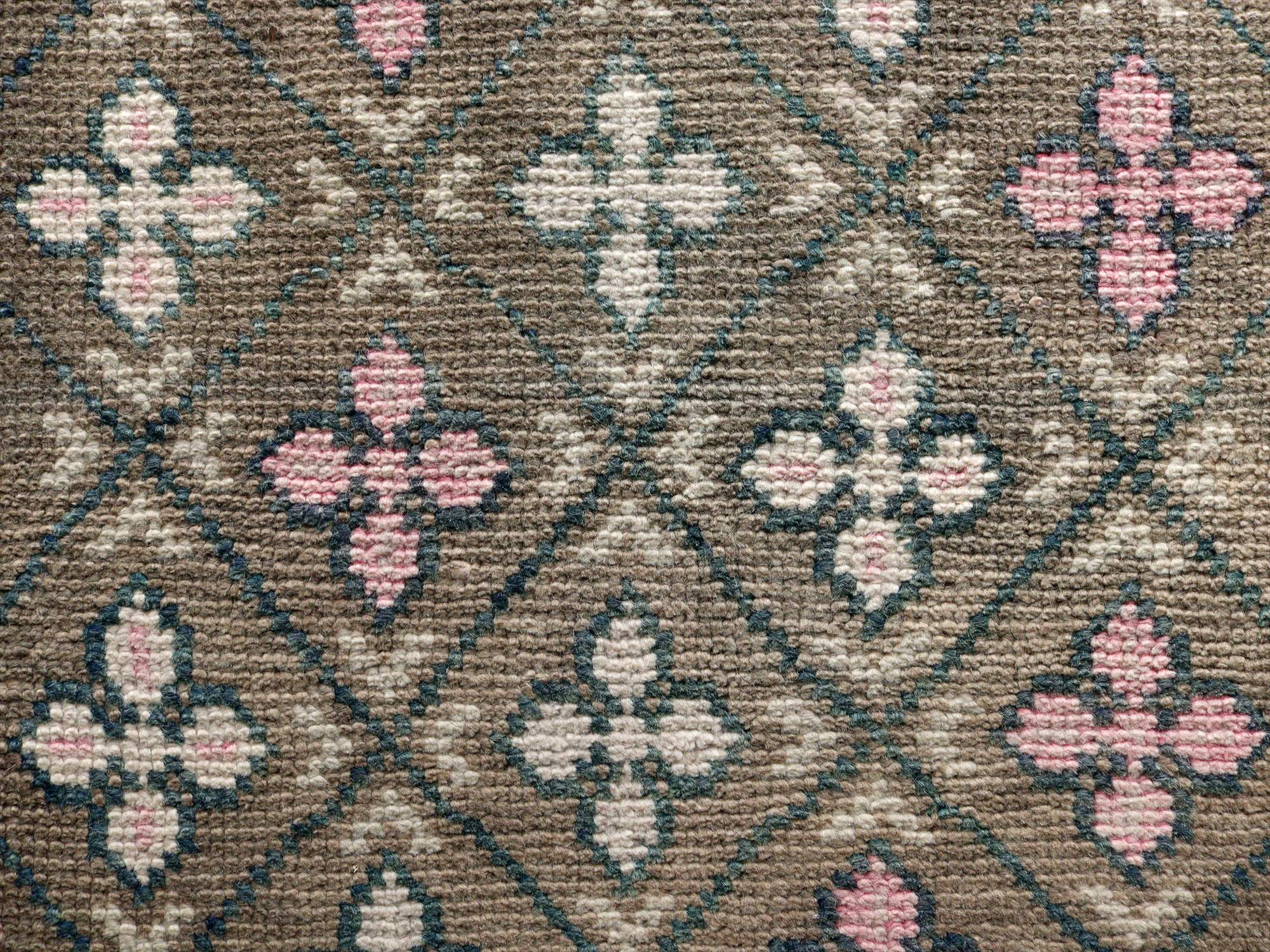 もともと大きいサイズだった絨毯からカットされたものと思われます。ブラウンベースに格子のデザイン、そこに花のような幾何学文様が連続しています。