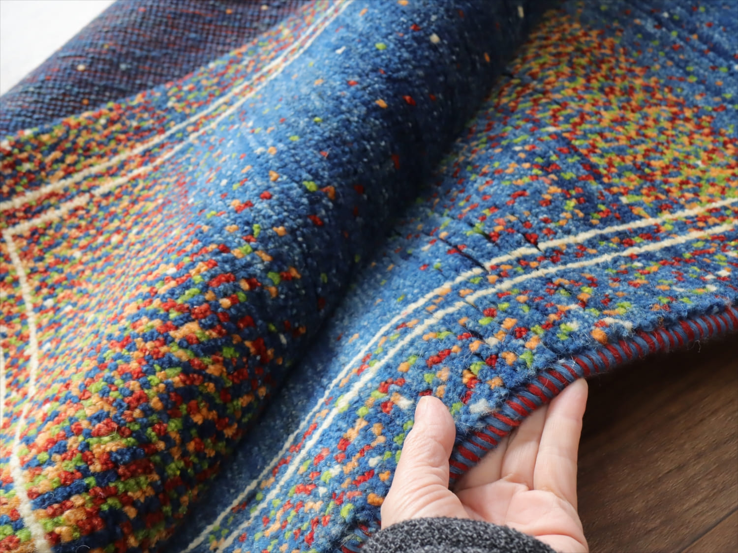 パイル(毛足)はすっきり刈り込んであり、ギャベ全体の厚みは1.3-1.4cm程度。