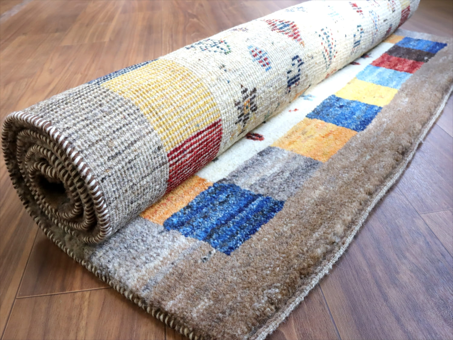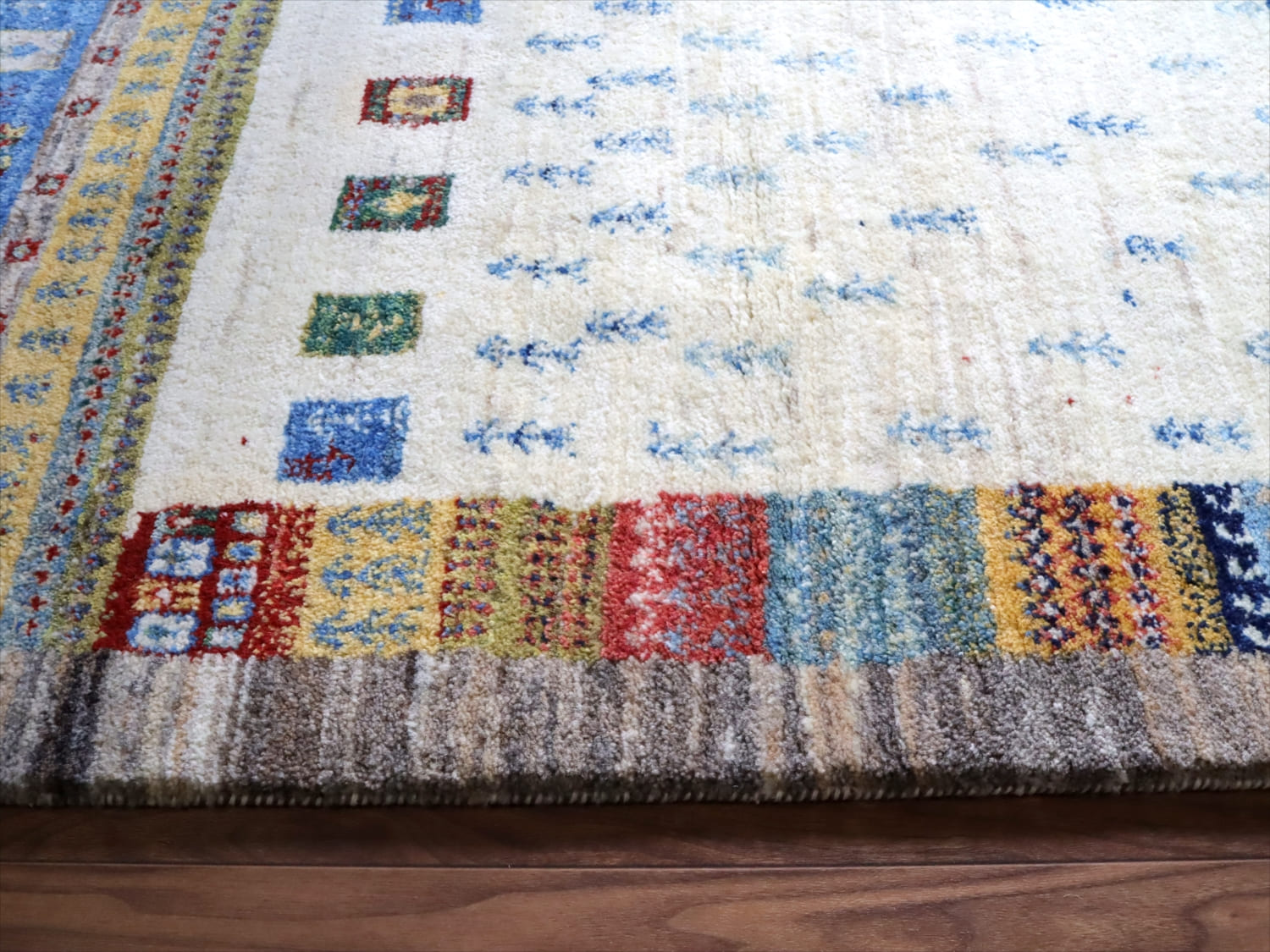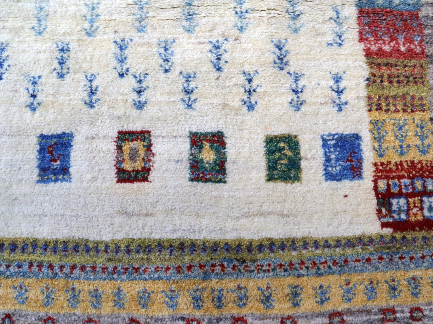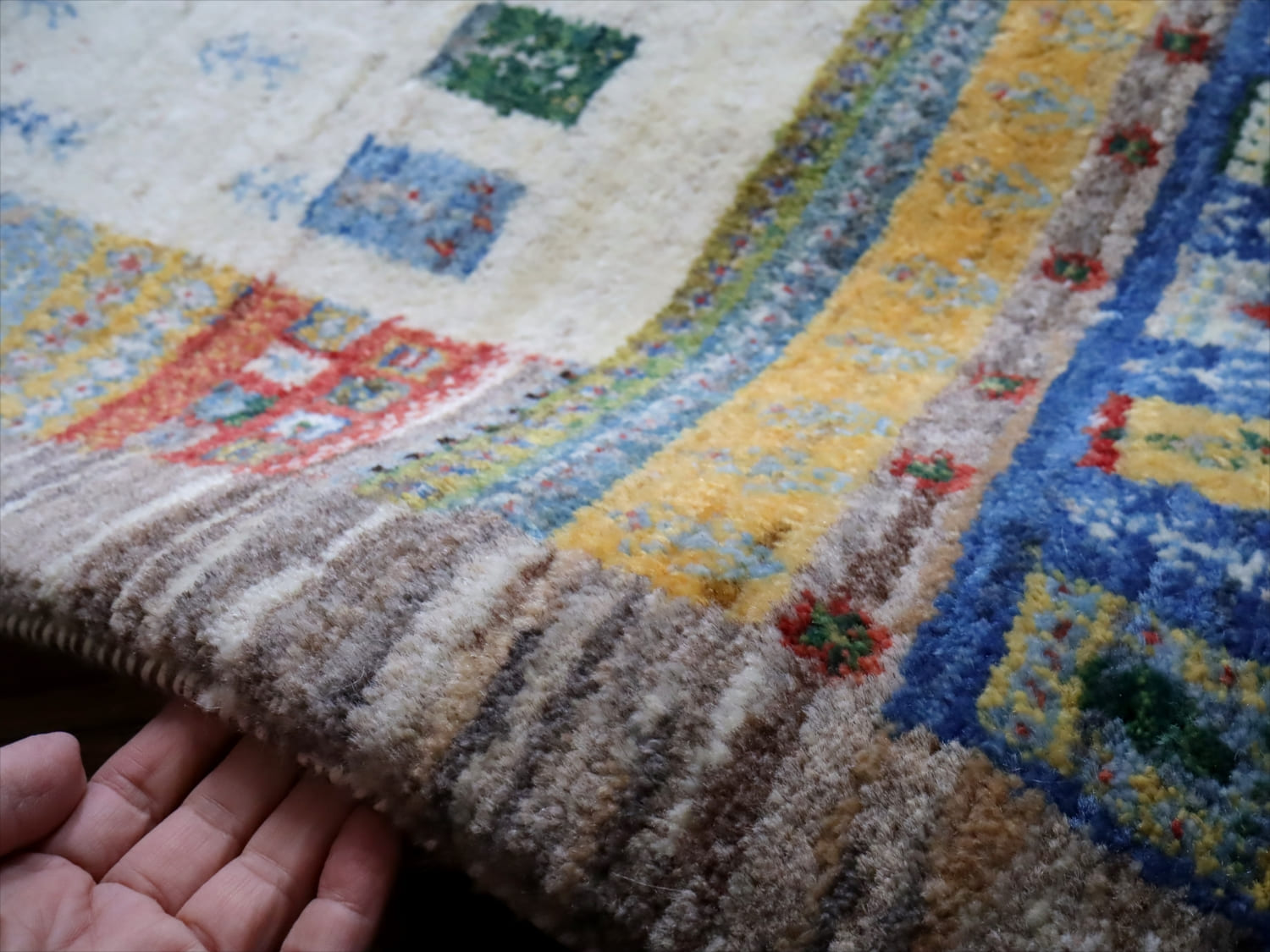 カラフルなタイルモチーフが楽しい、ギャッベらしさのある楽しいデザイン。ベースは天然の羊毛のアイボリーとグレー、そこに様々な色をミックスして、小さなモチーフが織り込まれています。織り目が細かく、素朴さと繊細さを合わせ持ったギャッベです。