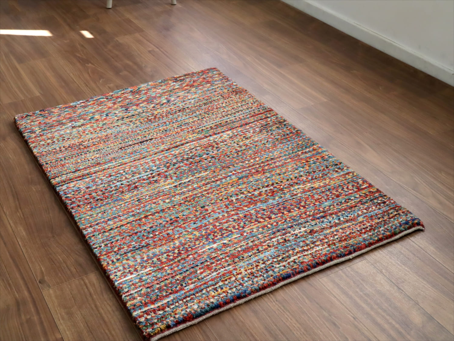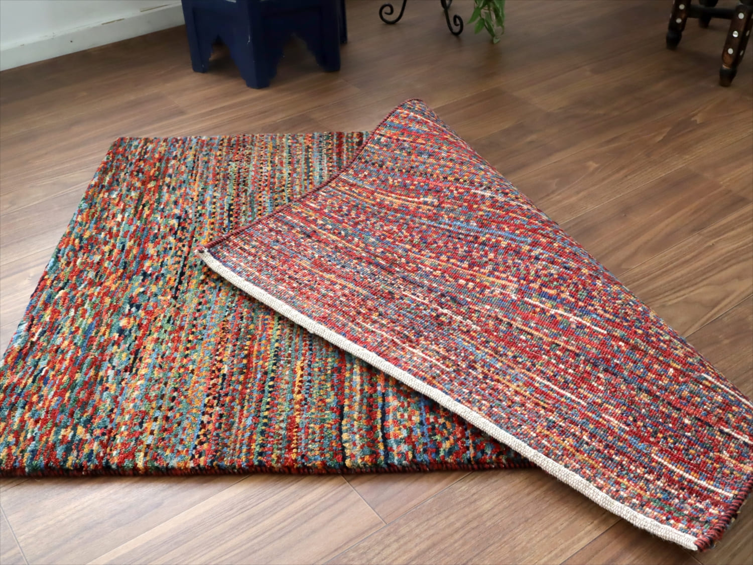 パイルを含めたギャッベの厚みは、1.6cm程度で、分厚いという感じではありませんが、ふっくらとしています。ぎゅっと織り目が詰まって、弾力があります。