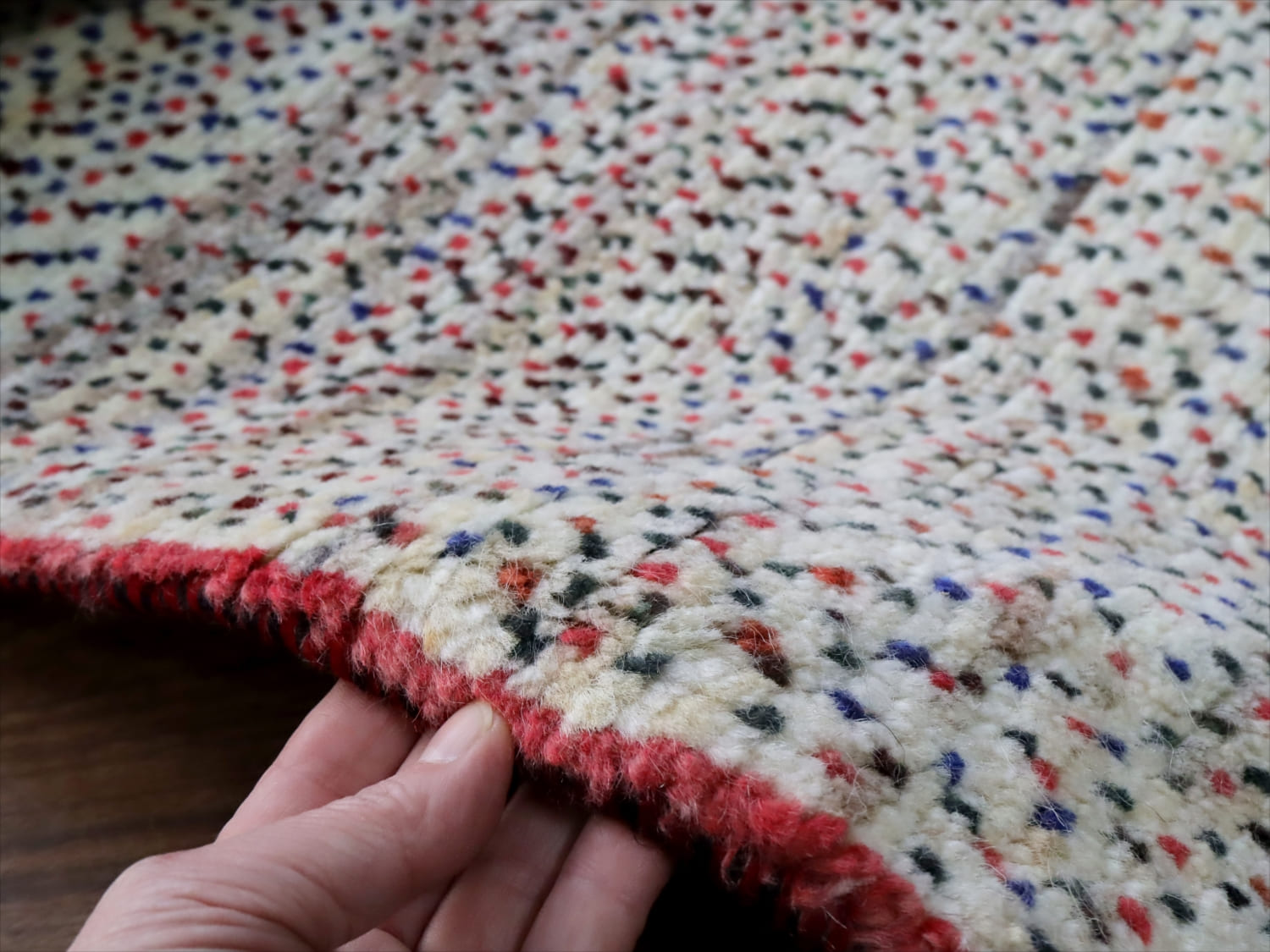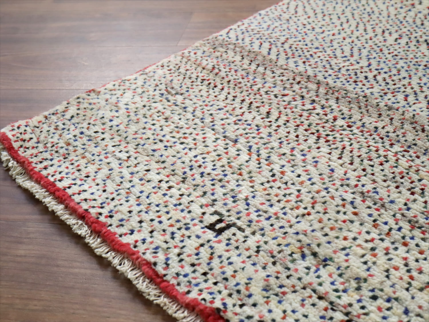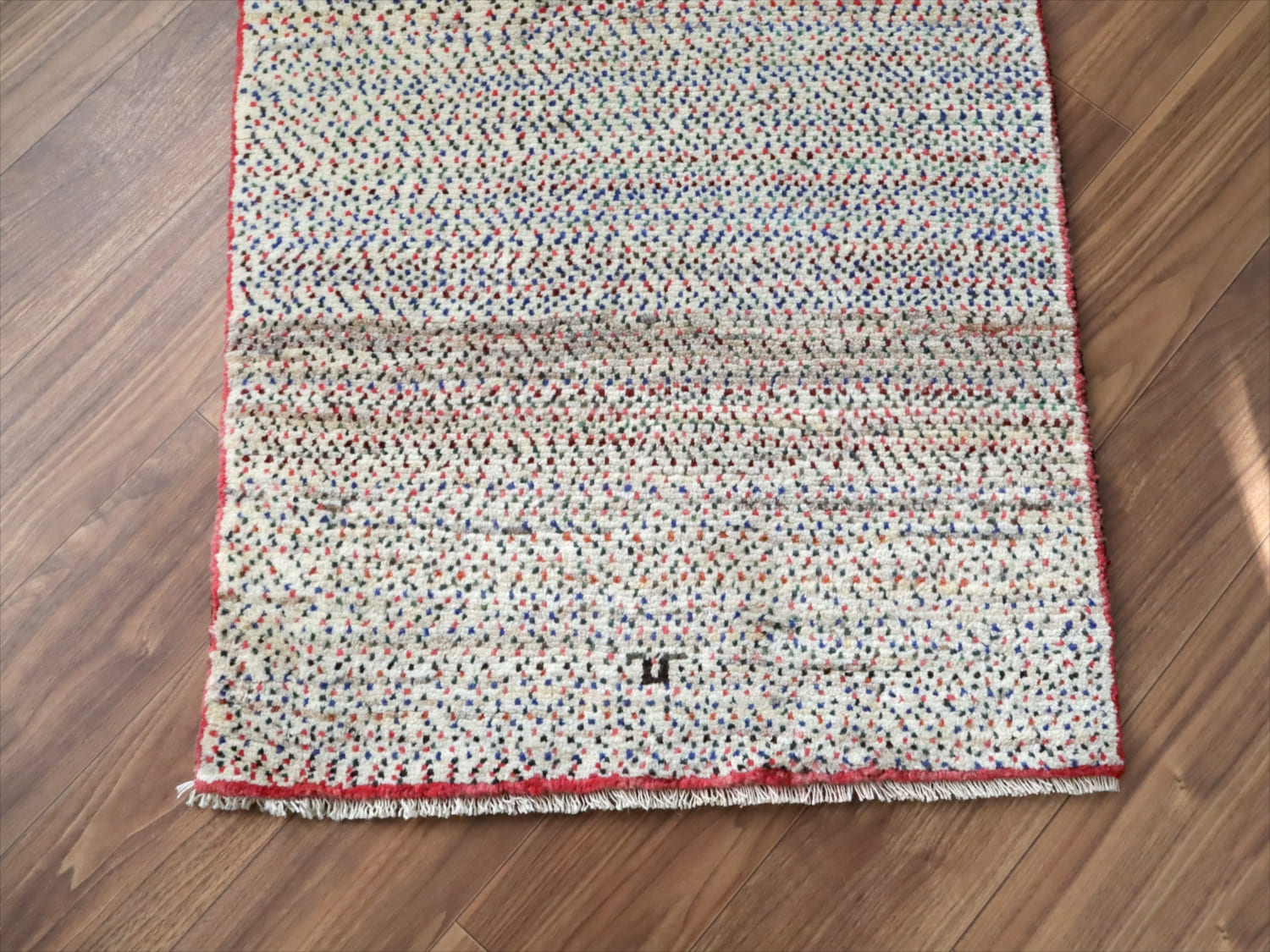 天然の羊毛の色をベースに、赤、青の小さなドットが全面に織り込まれています。ドットの密度が、途中で変化していてユニークです。周囲に赤いラインが入っているのも、洒落ていますね。