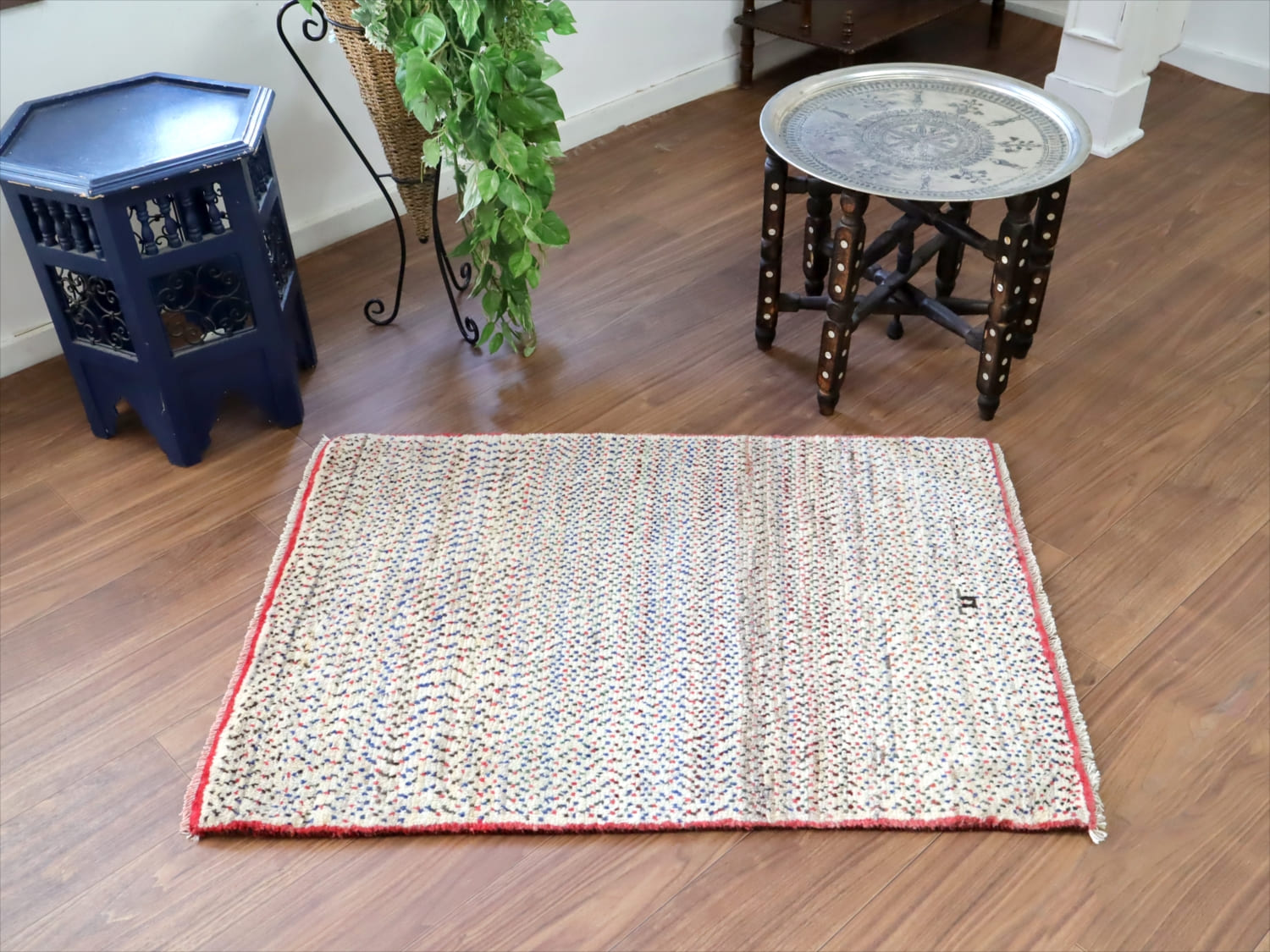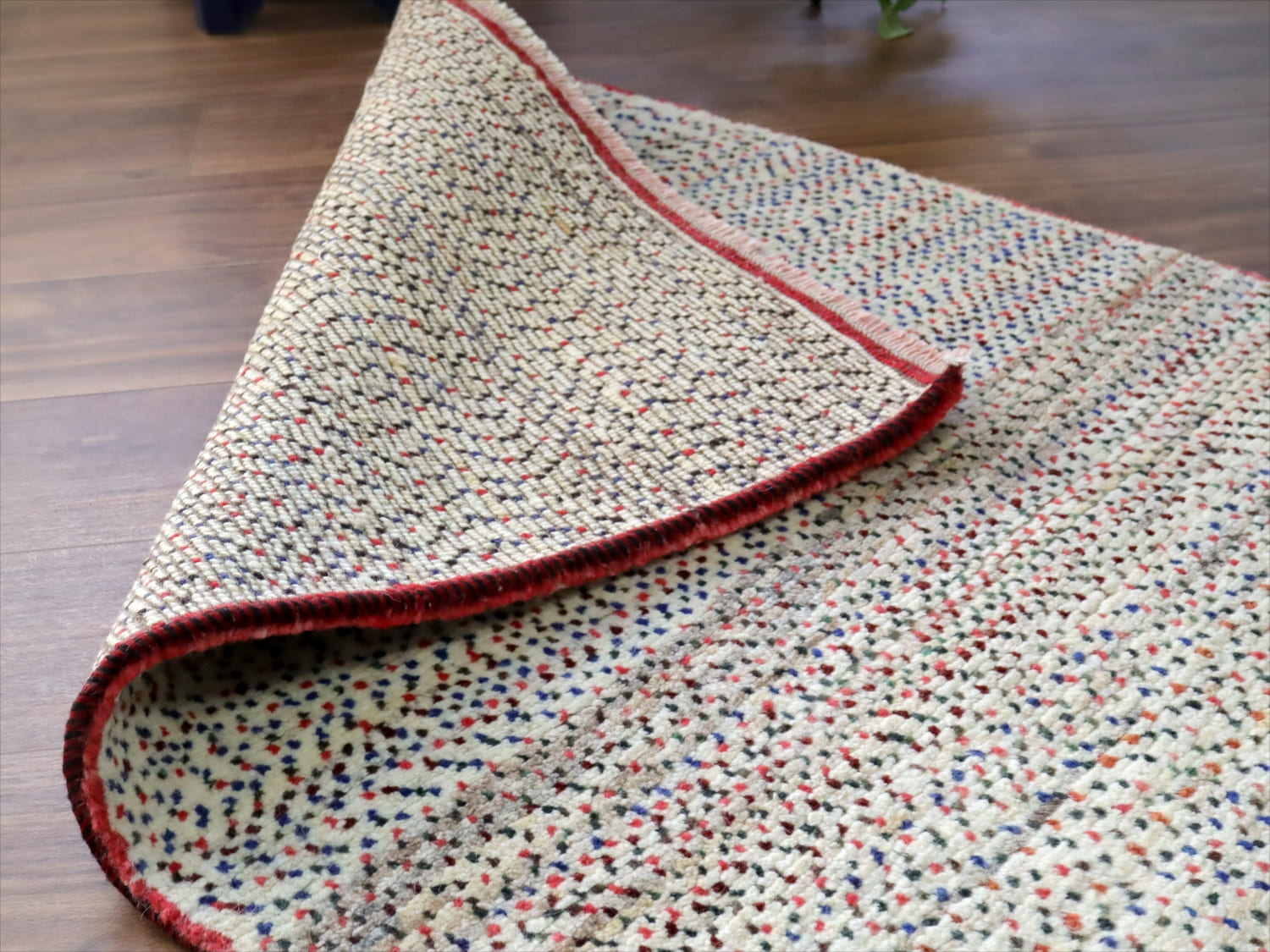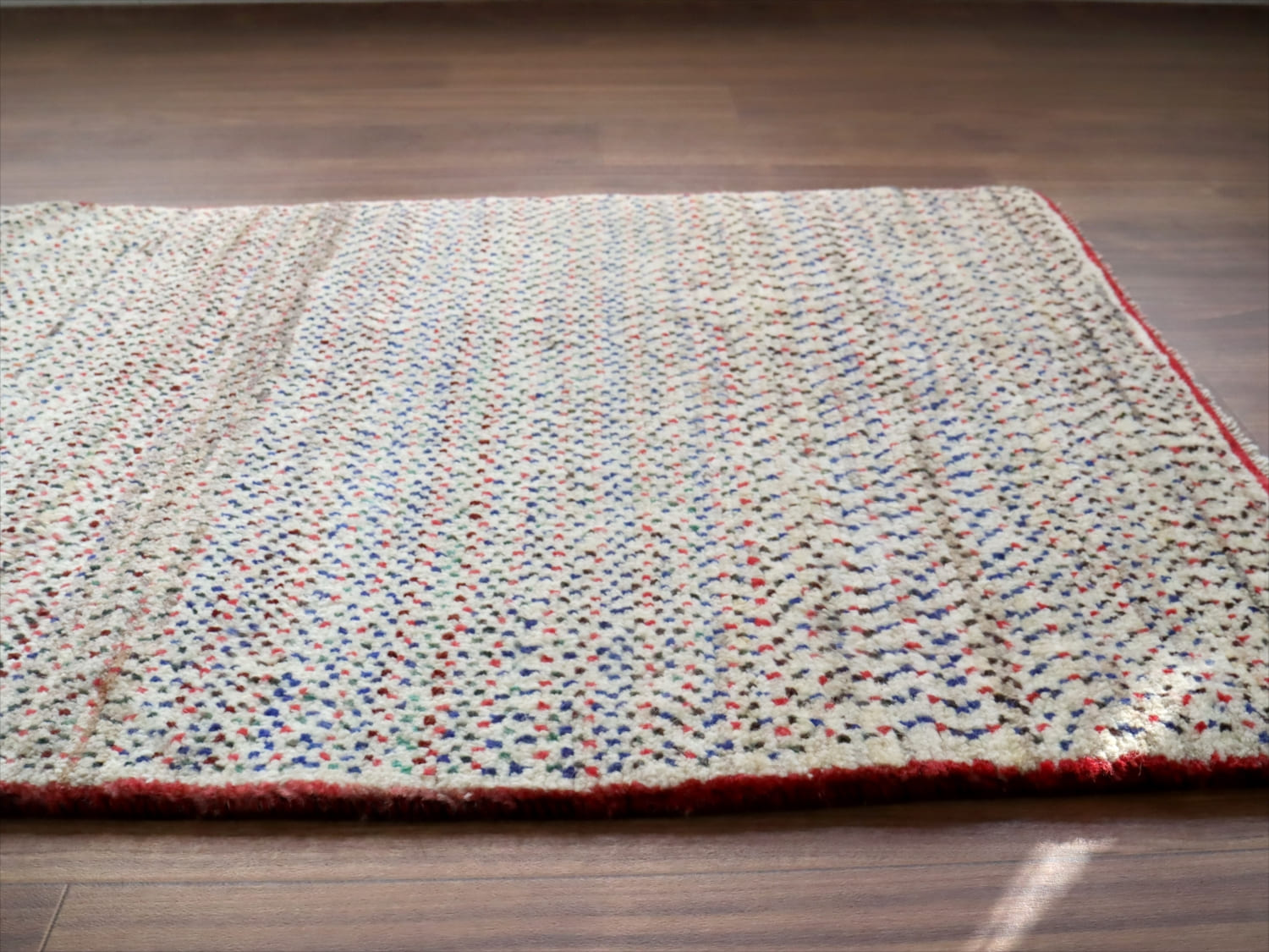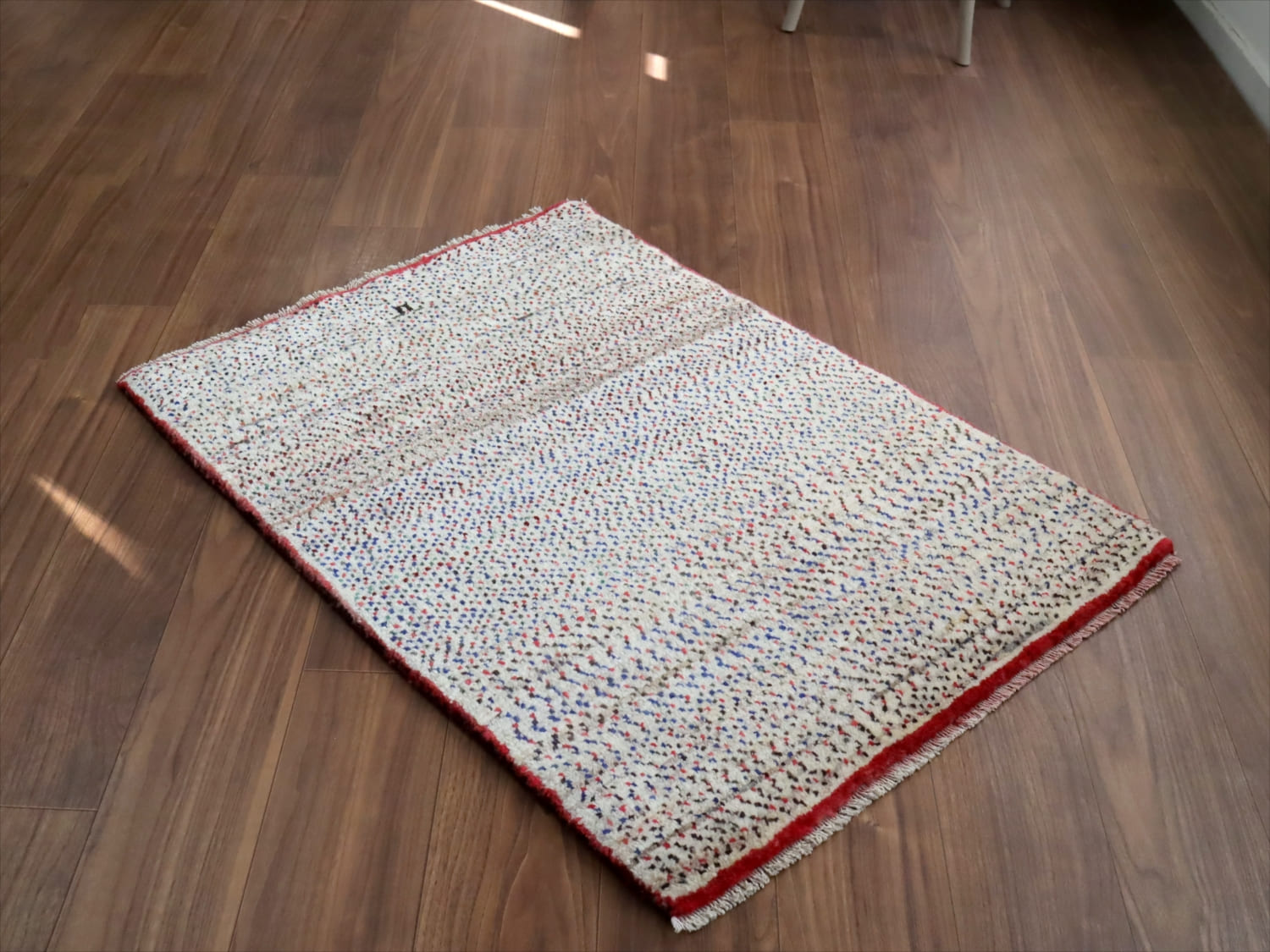 天然の羊毛の色をベースに、赤、青の小さなドットが全面に織り込まれています。ドットの密度が、途中で変化していてユニークです。周囲に赤いラインが入っているのも、洒落ていますね。