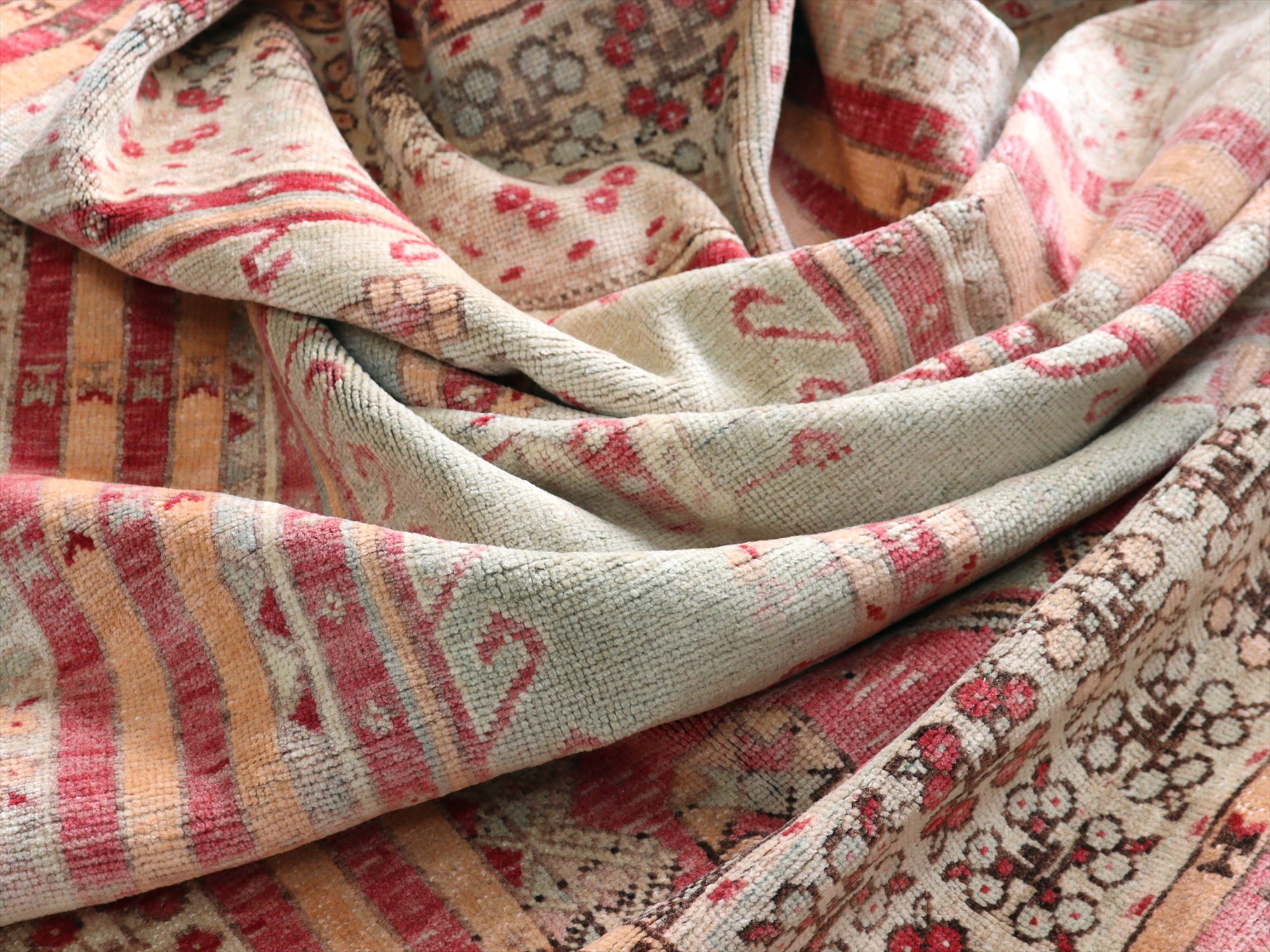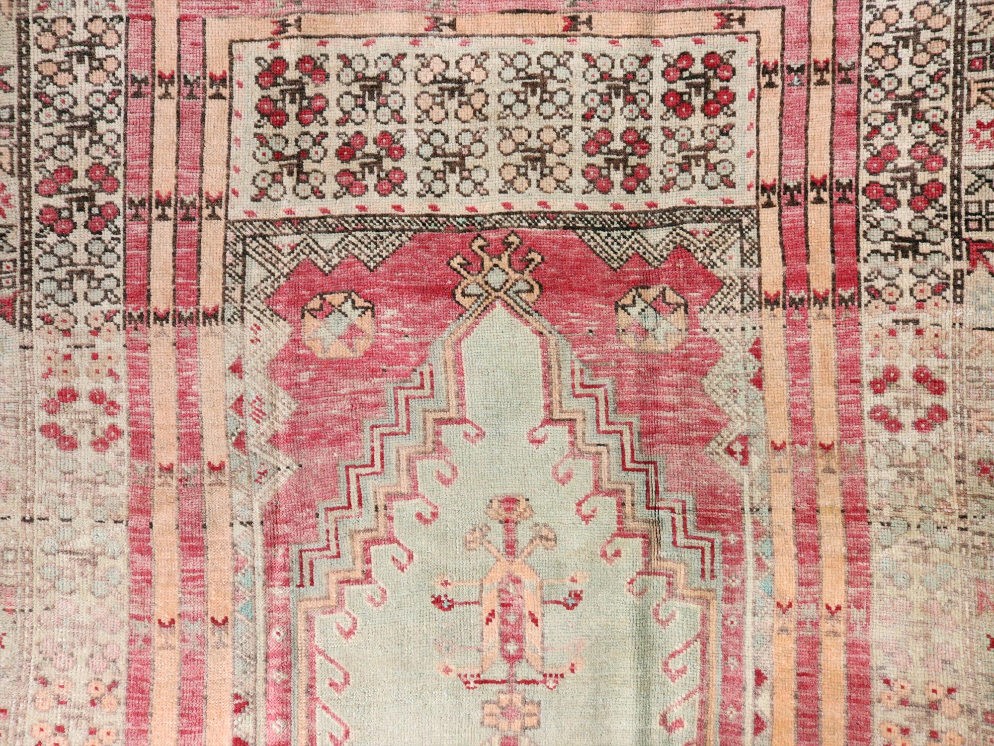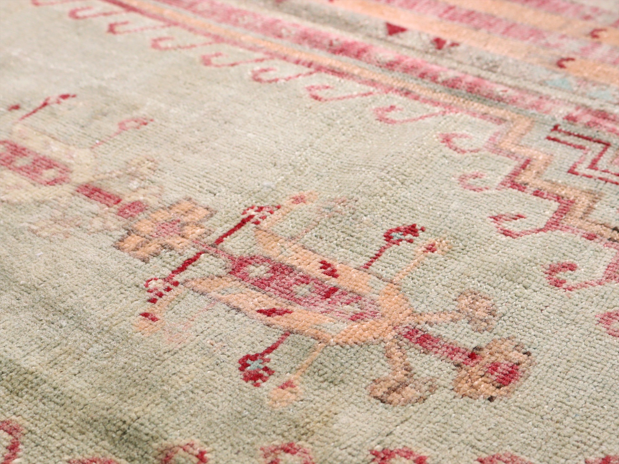 グリーン、レッド、オレンジを基調とした色使いで、ミフラープ(お祈りの方向を示すくぼみ)が織られています。日焼けして色褪せたのか、ブリーチによるものなのかは定かではありませんが、だいぶ落ち着いた色合いになりました。特に、グリーンの部分は色褪せたことにより、グレーがかった緑のようにも見えます。