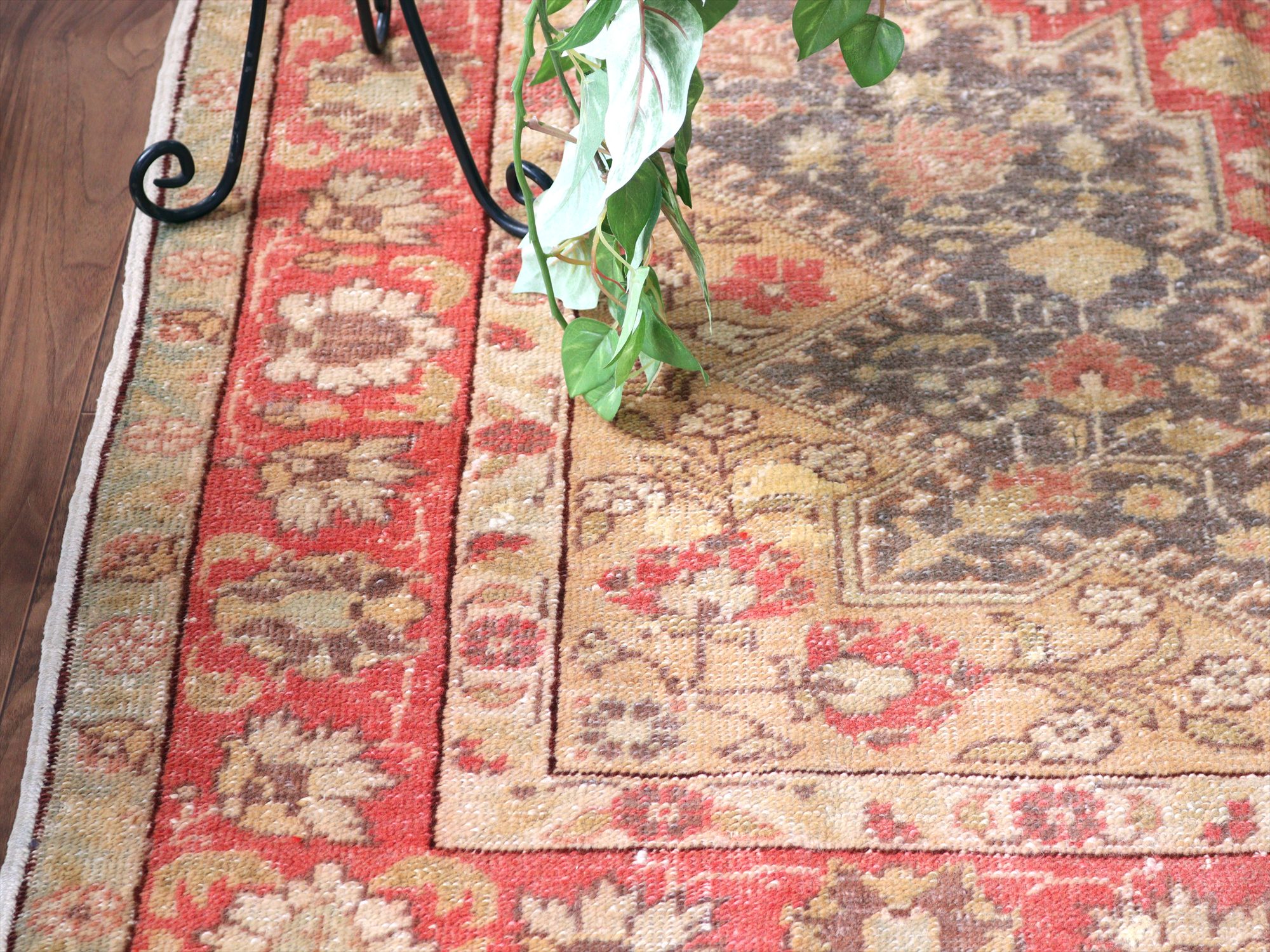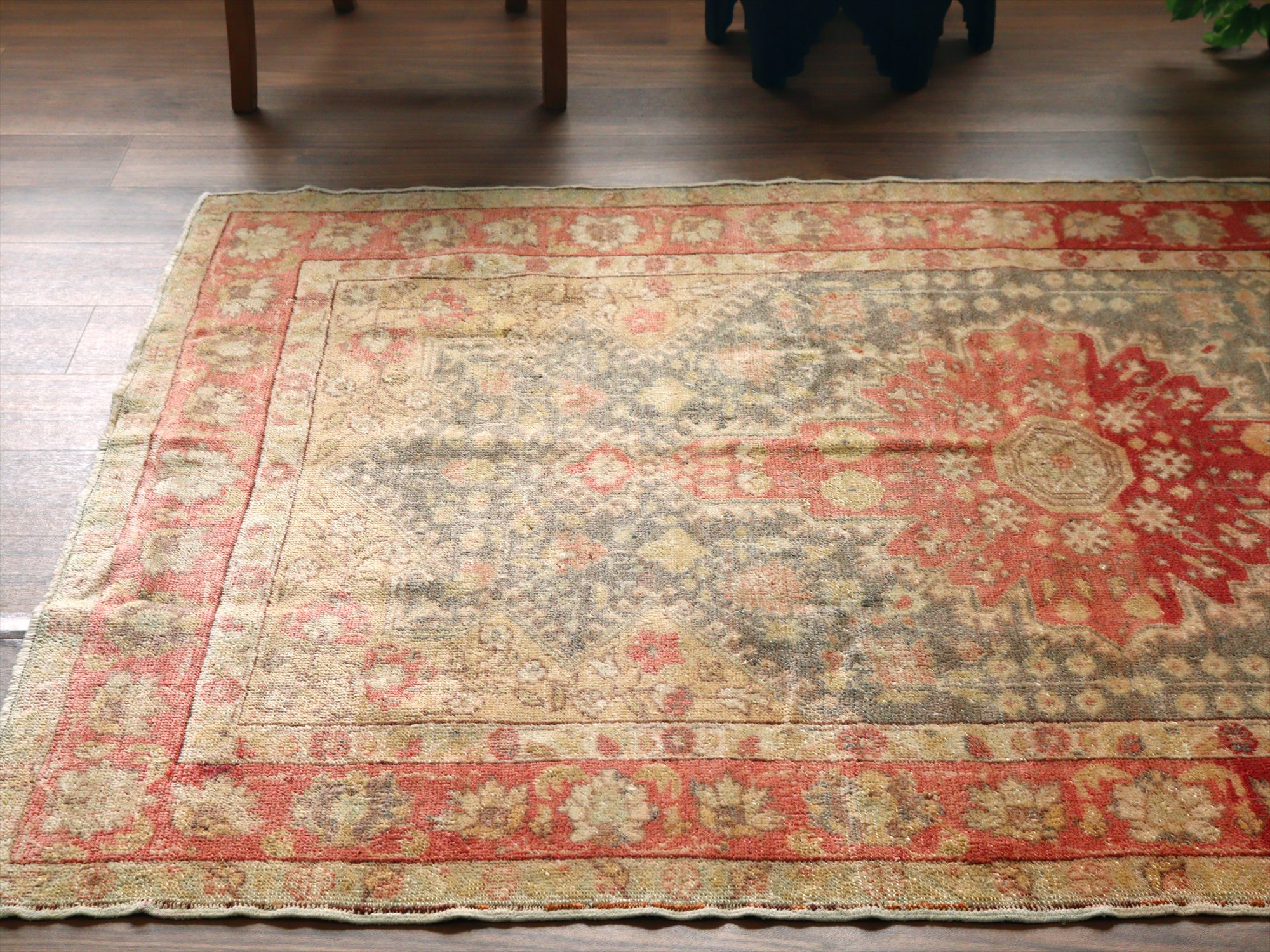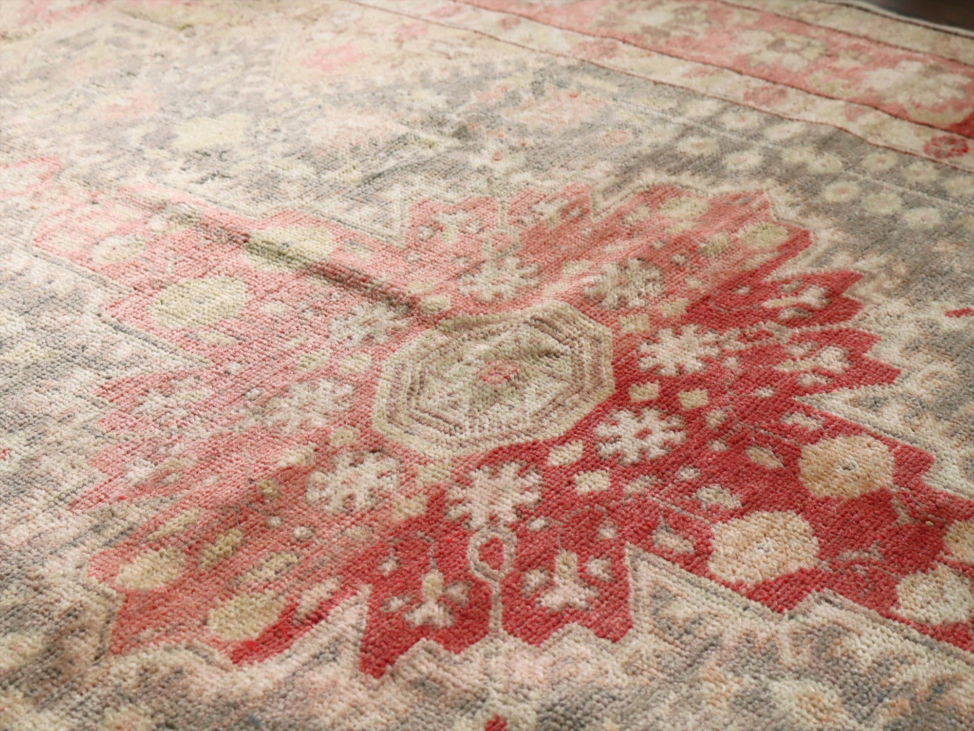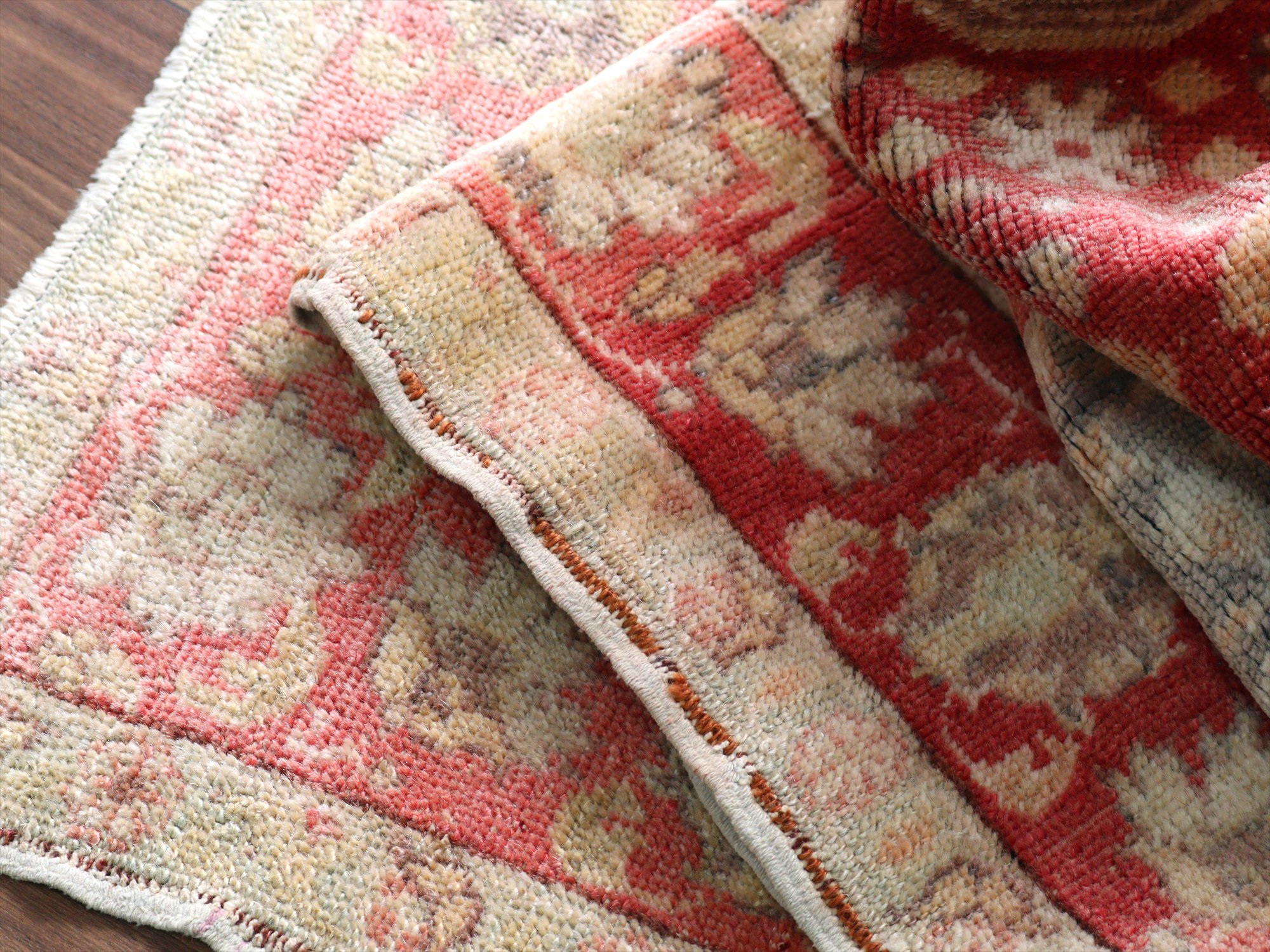 中央にレッドとネイビーの組み合わせでメダリオンがおかれ、その周りと枠部部分には小花が連なるように織られたクラシカルで上品なデザイン。色褪せたことにより、ネイビーの部分はグレーがかって見えます。
