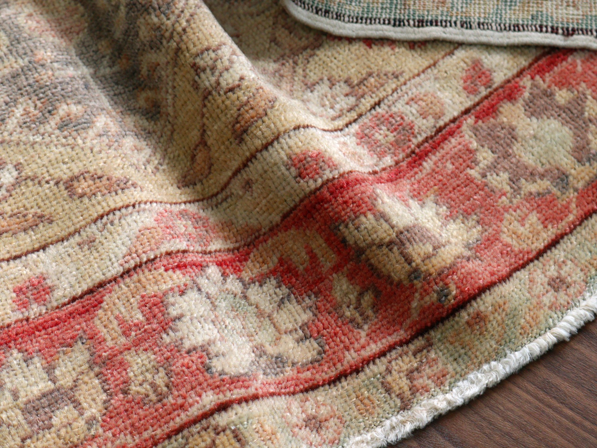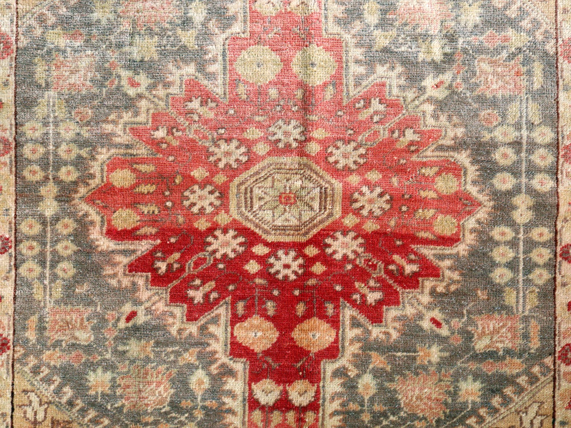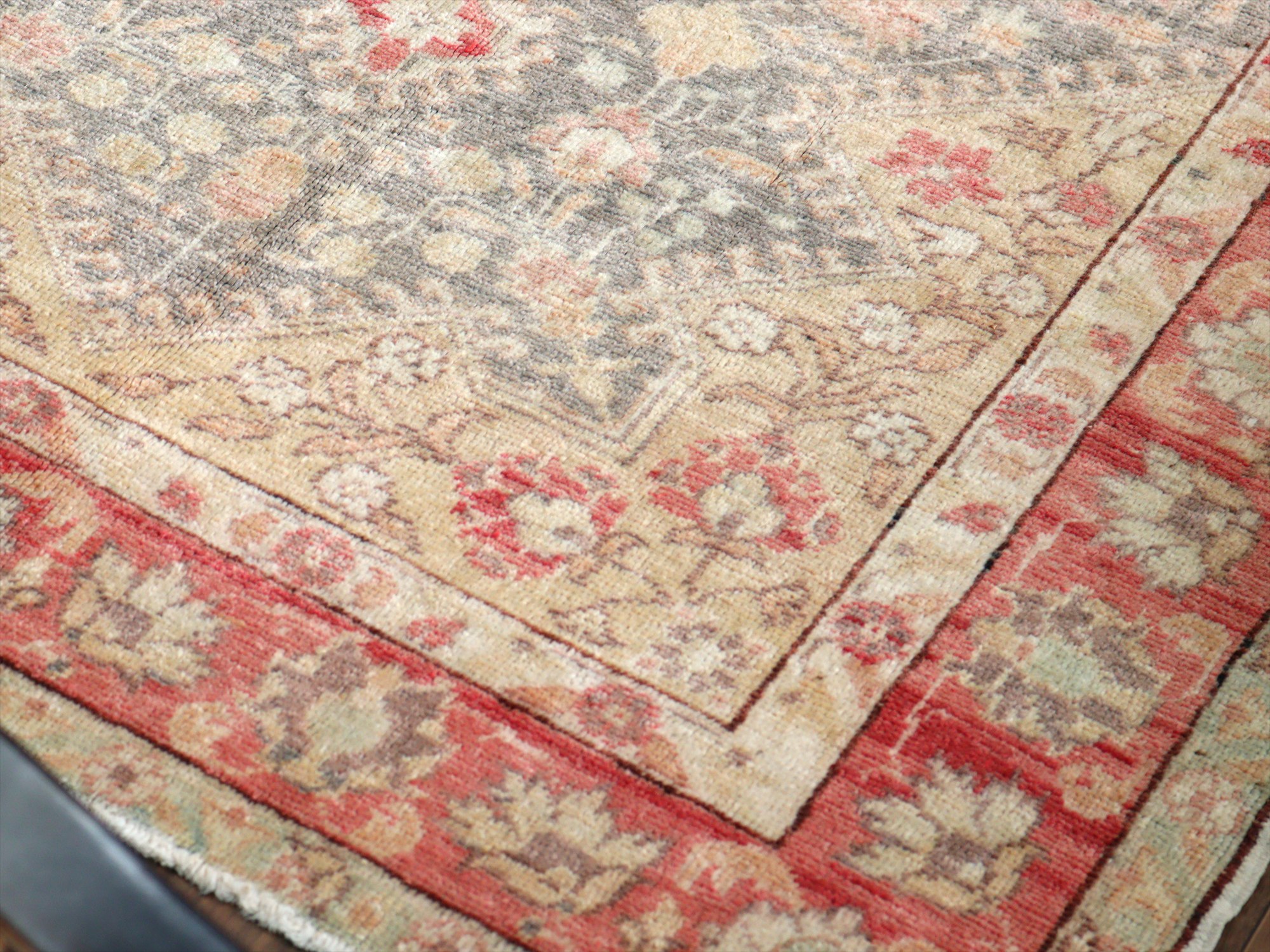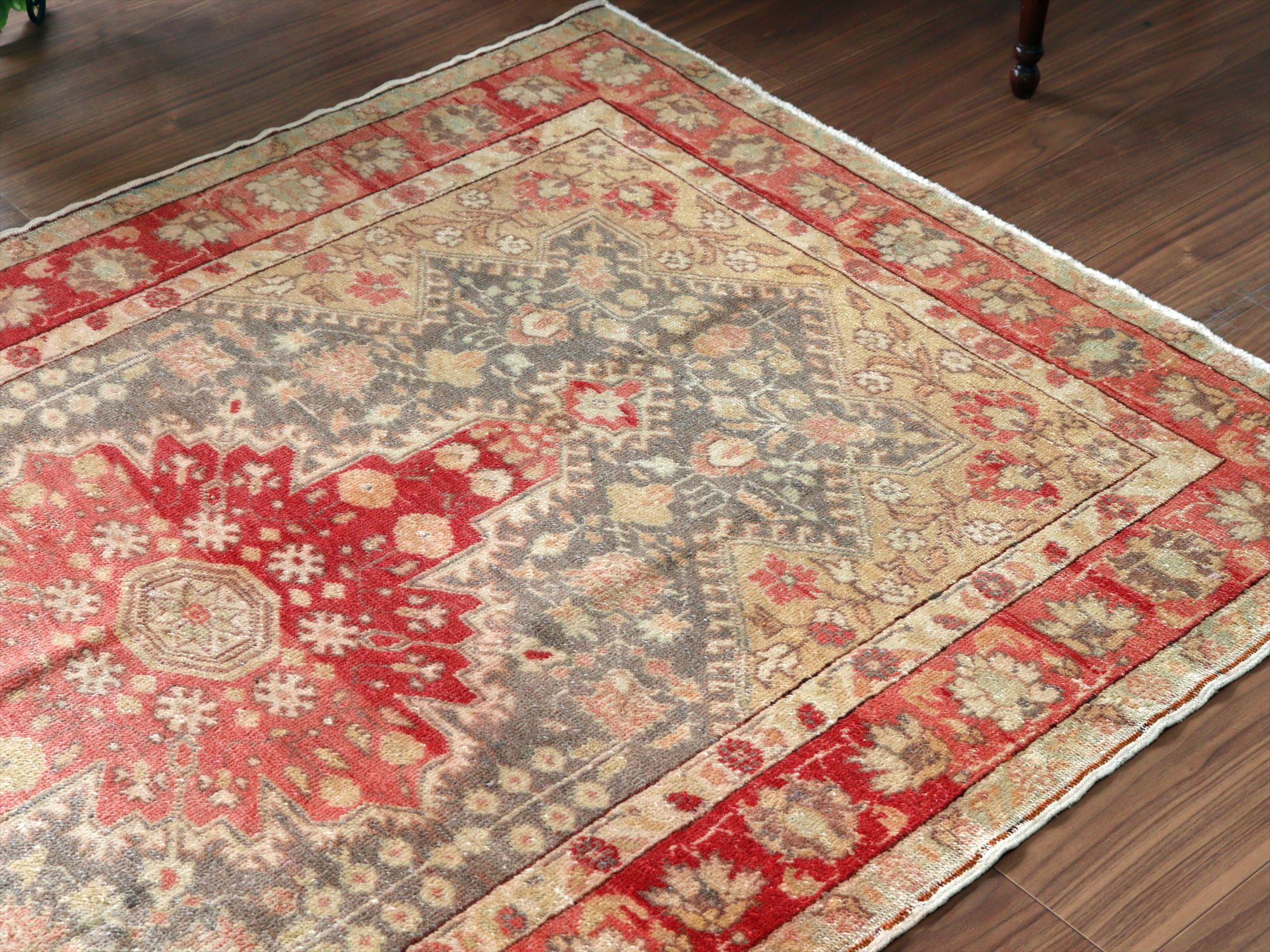 中央にレッドとネイビーの組み合わせでメダリオンがおかれ、その周りと枠部部分には小花が連なるように織られたクラシカルで上品なデザイン。色褪せたことにより、ネイビーの部分はグレーがかって見えます。