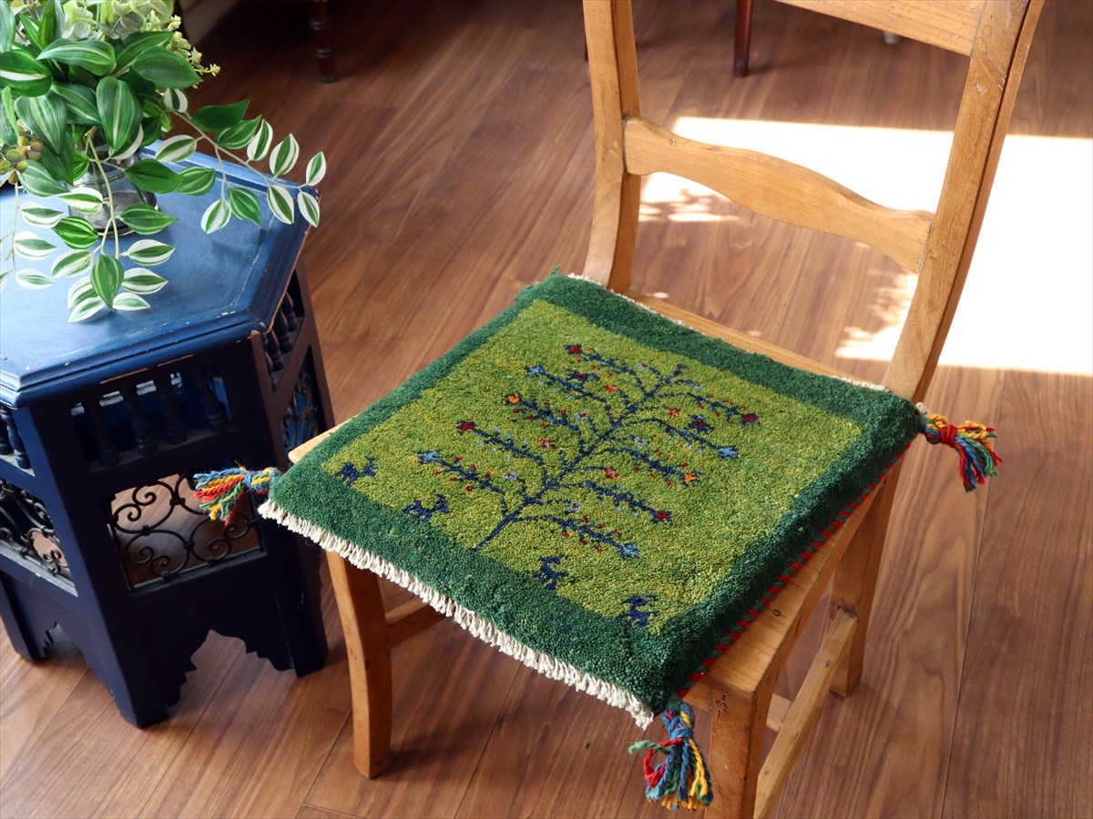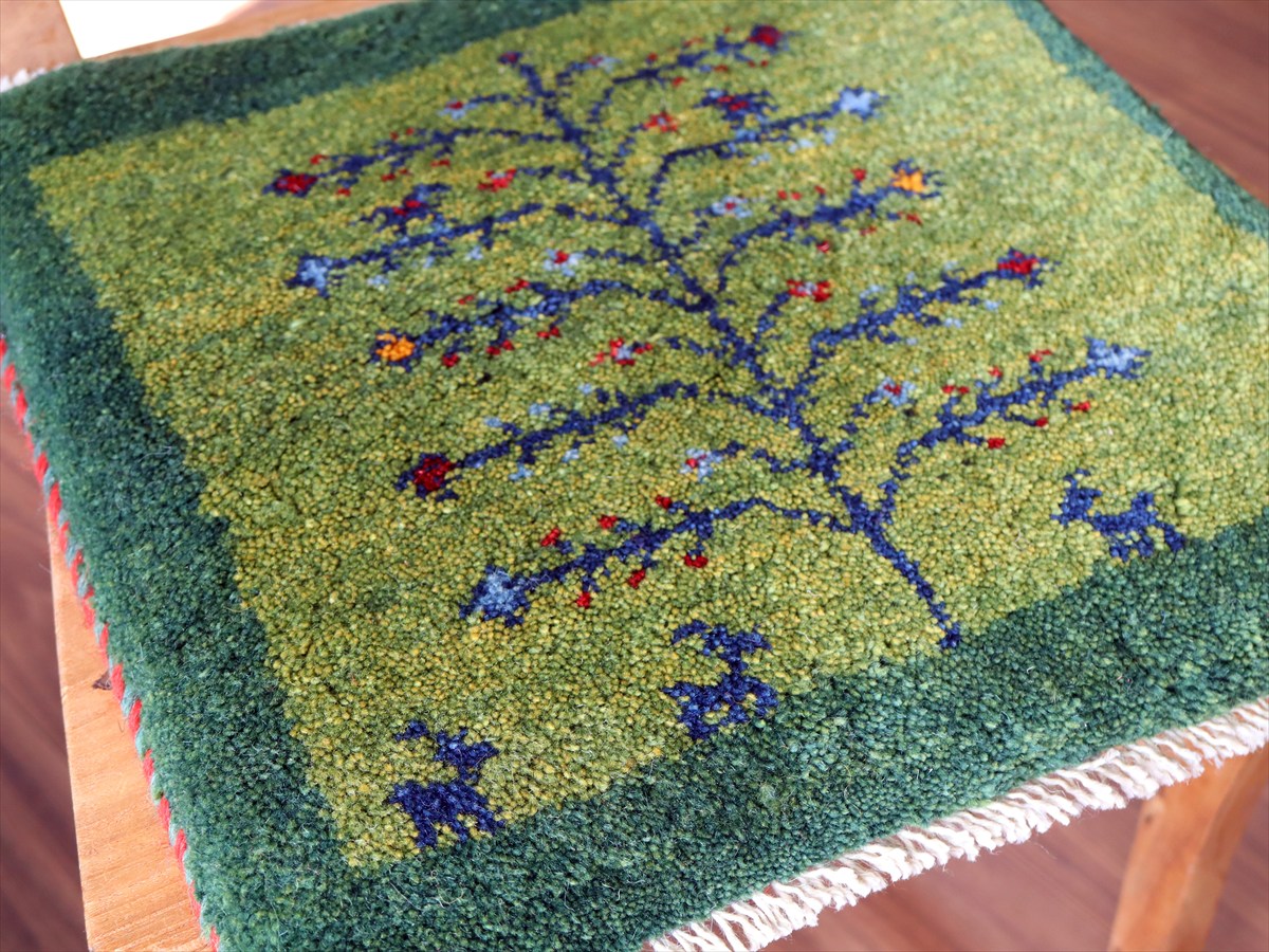 - ギャッベ イラン産手織り 座布団サイズ 38×38cm グリーン 動物と生命の樹