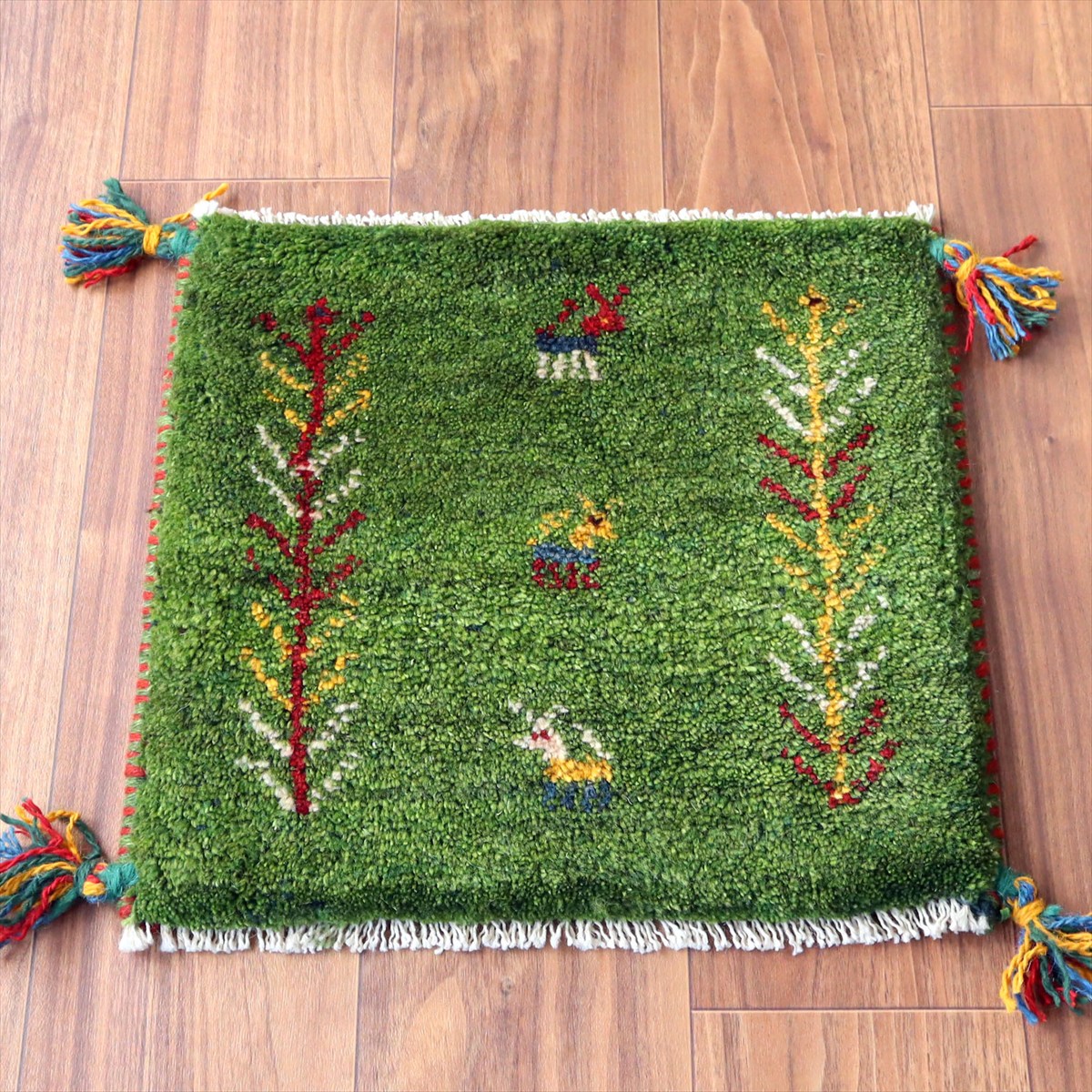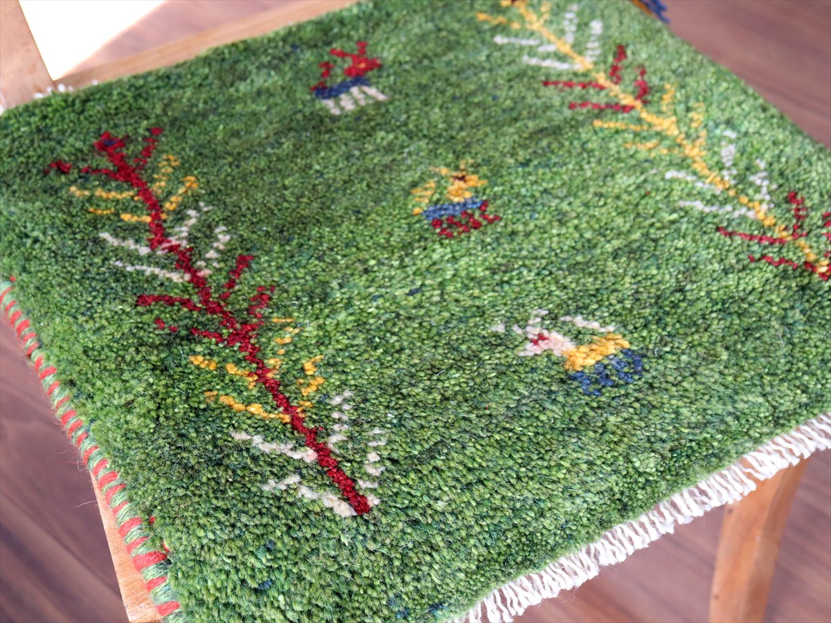 ギャッベ イラン産手織り 座布団サイズ 38×41cm グリーン 動物と連なる生命の樹