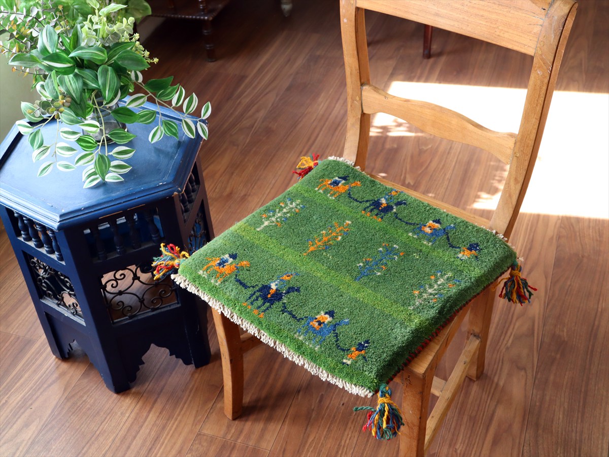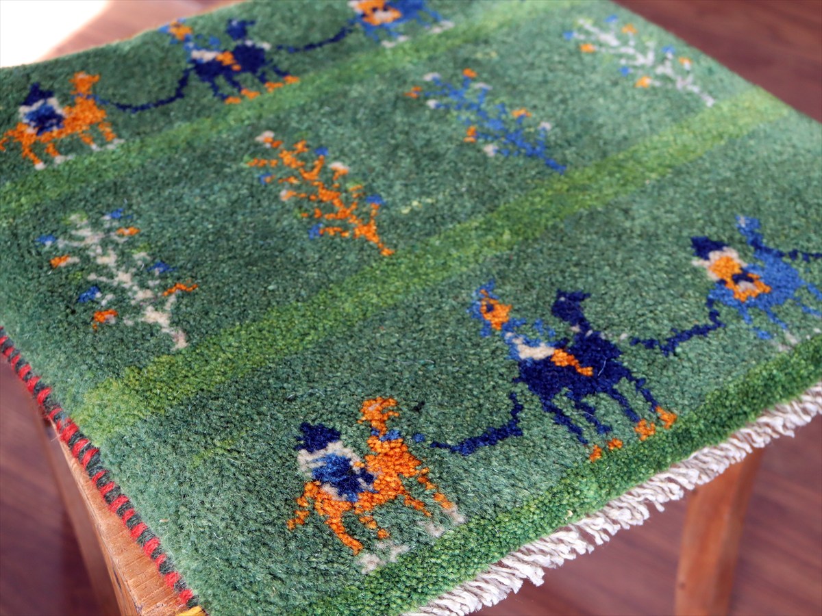 ギャッベ イラン産手織り 座布団サイズ 39×41cm グリーン ラクダのキャラバンとと生命の樹