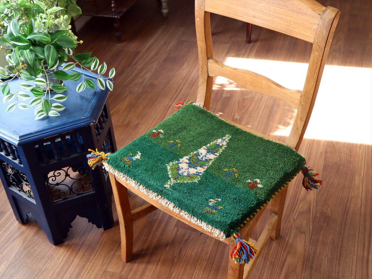 ギャッベ イラン産手織り 座布団サイズ 34×41cm グリーン 動物と糸杉