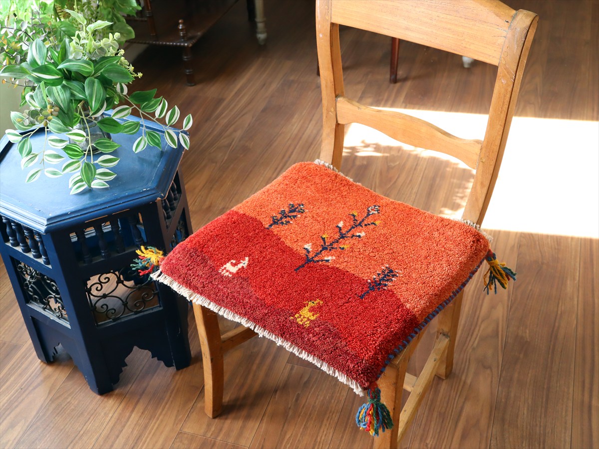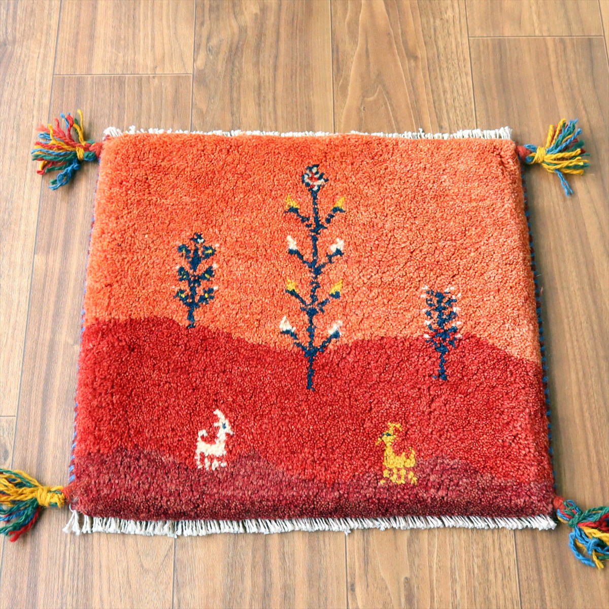 - ギャッベ イラン産手織り 座布団サイズ 40×44cm レッド 生命の樹と動物 風景画
