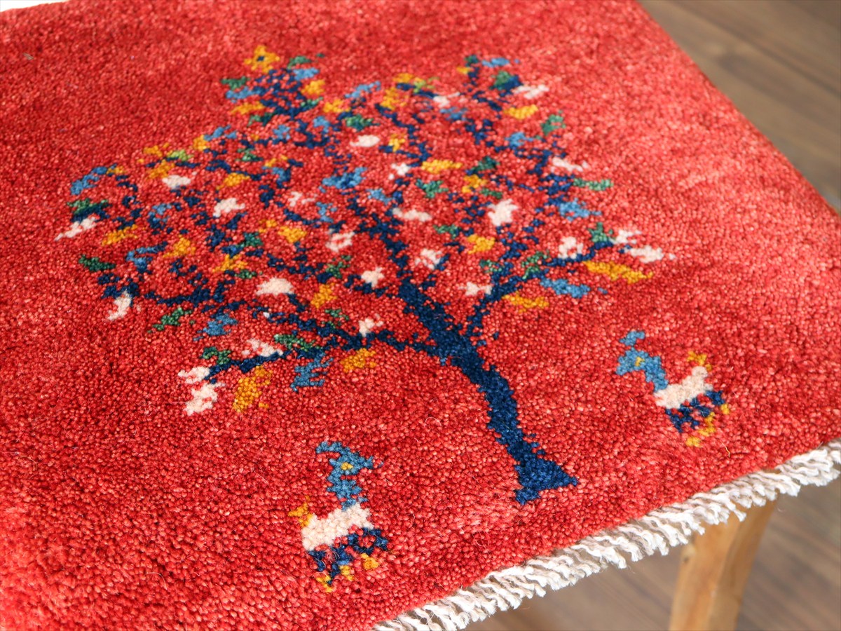 ギャッベ イラン産手織り 座布団サイズ 40×42cm レッド カラフルな生命の樹と動物