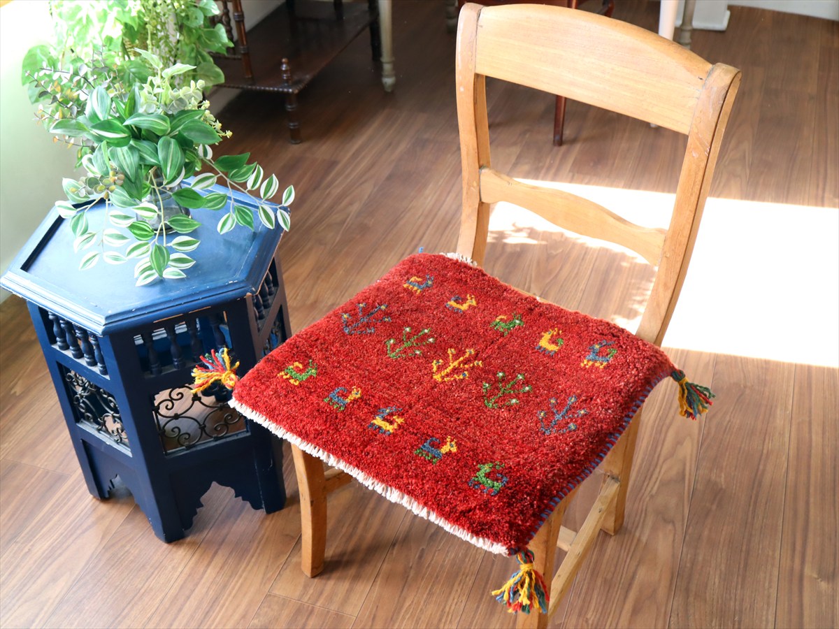 - ギャッベ イラン産手織り 座布団サイズ 40×46cm レッド カラフルな生命の樹と動物