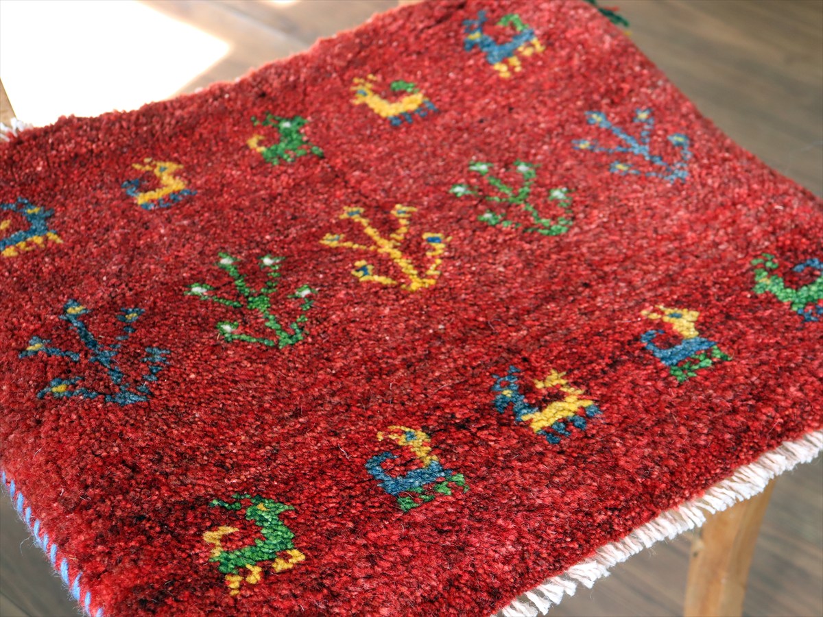 ギャッベ イラン産手織り 座布団サイズ 40×46cm レッド カラフルな生命の樹と動物