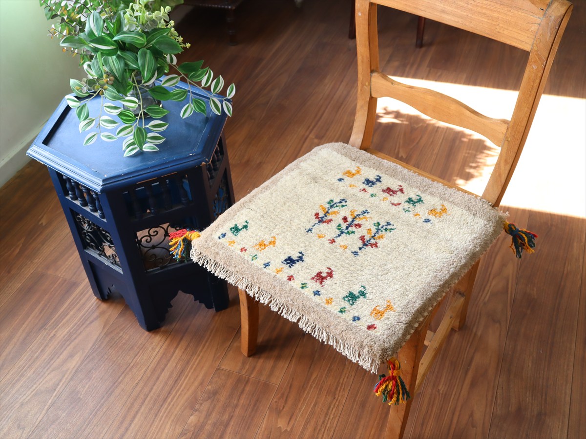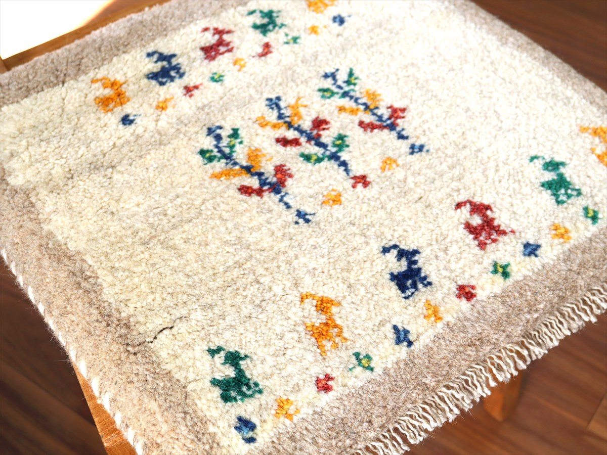 ギャッベ イラン産手織り 座布団サイズ 42×43cm ナチュラルアイボリー カラフルな動物と生命の樹
