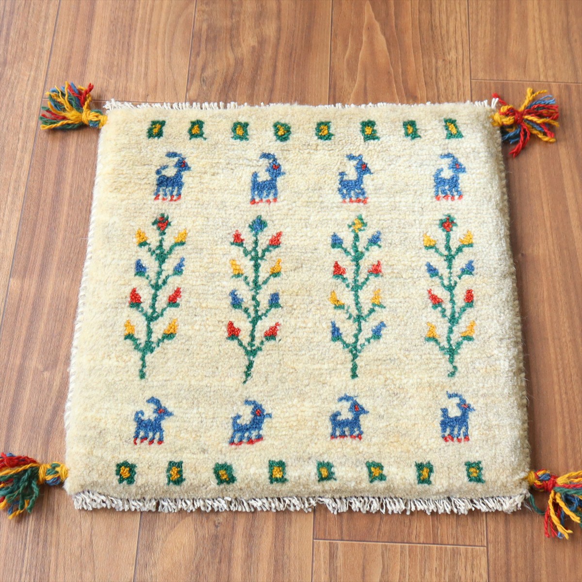 - ギャッベ イラン産手織り 座布団サイズ 42×42cm ナチュラルアイボリー 動物と連なるカラフルな生命の樹