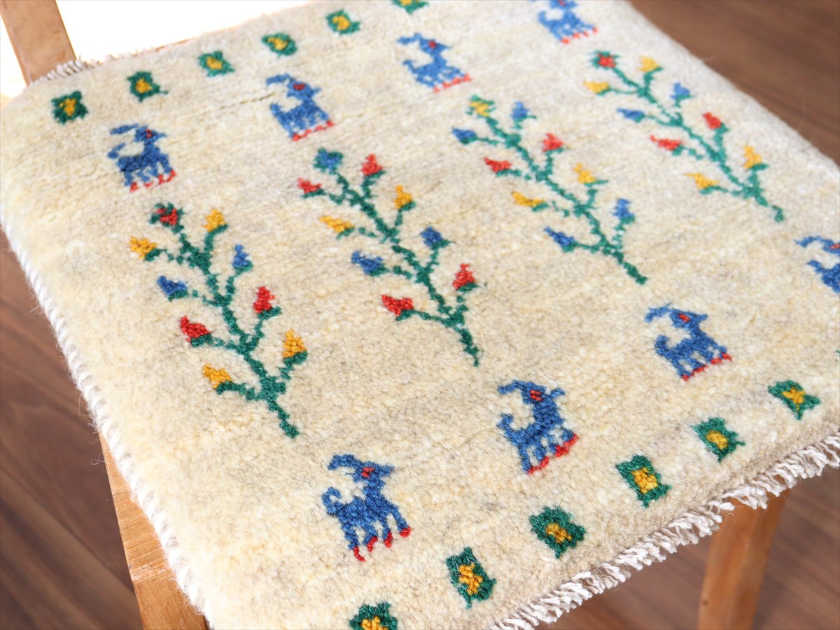 ギャッベ イラン産手織り 座布団サイズ 42×42cm ナチュラルアイボリー 動物と連なるカラフルな生命の樹