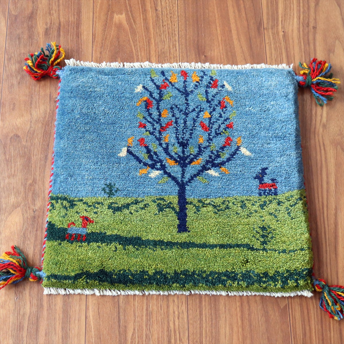 - ギャッベ イラン産手織り 座布団サイズ 38×41cm ブルー&グリーン 動物と生命の樹 風景画