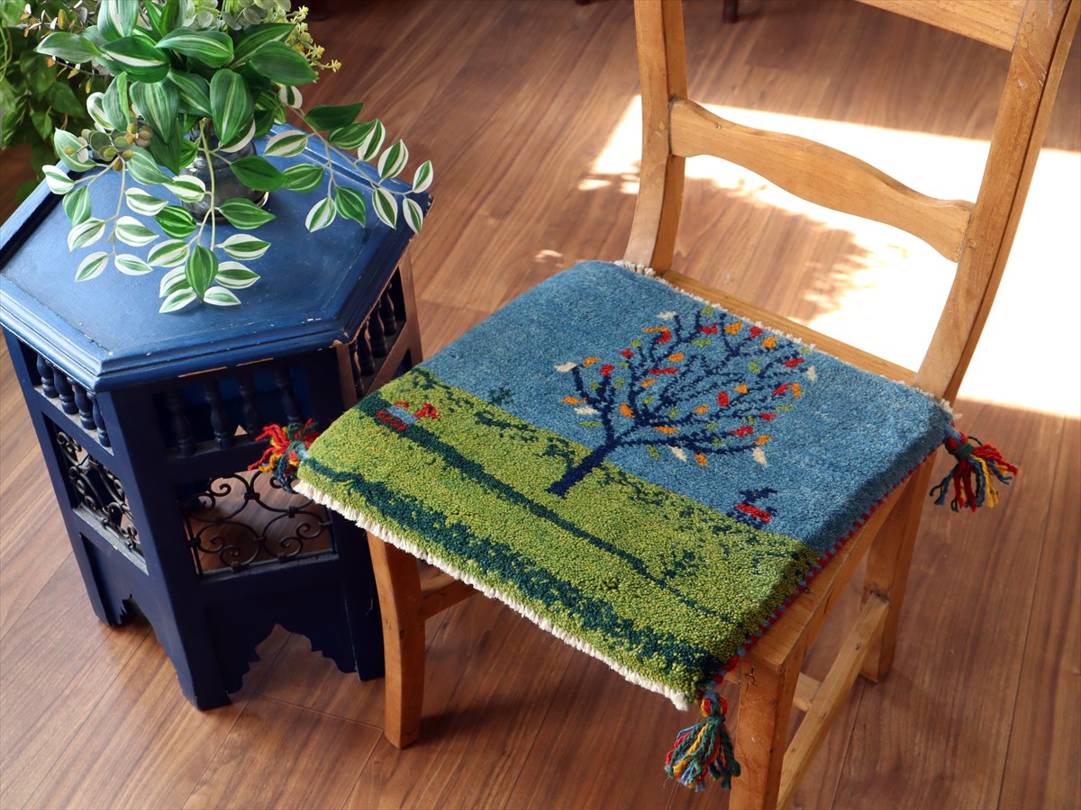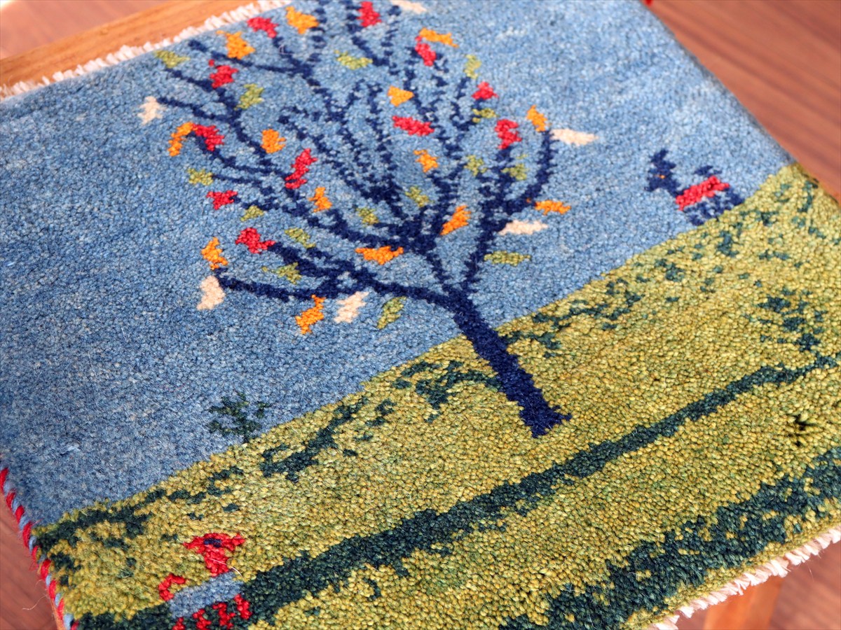 ギャッベ イラン産手織り 座布団サイズ 38×41cm ブルー&グリーン 動物と生命の樹 風景画