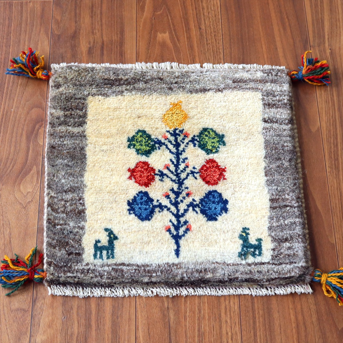 ギャッベ イラン産手織り 座布団サイズ 39×41cm ナチュラルアイボリー 動物とカラフルなザクロの樹