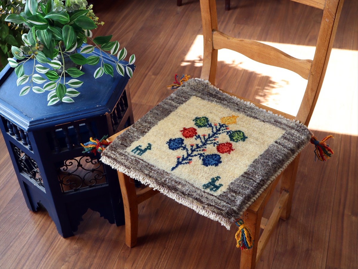 - ギャッベ イラン産手織り 座布団サイズ 39×41cm ナチュラルアイボリー 動物とカラフルなザクロの樹