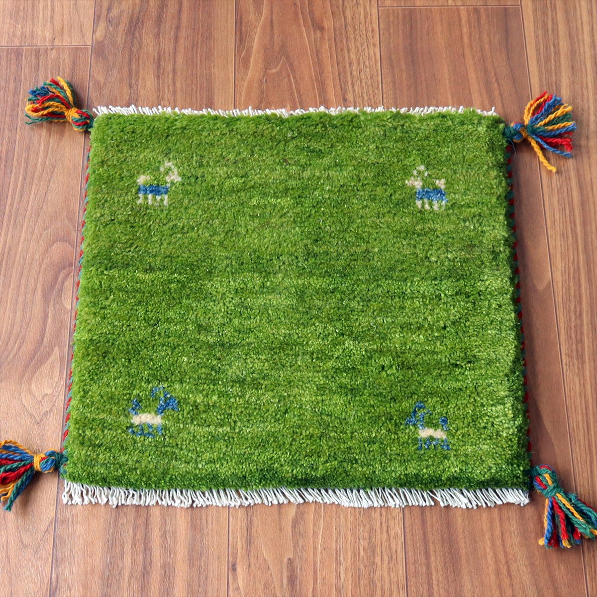 - ギャッベ イラン産手織り 座布団サイズ 38×42cm グリーン 動物モチーフ