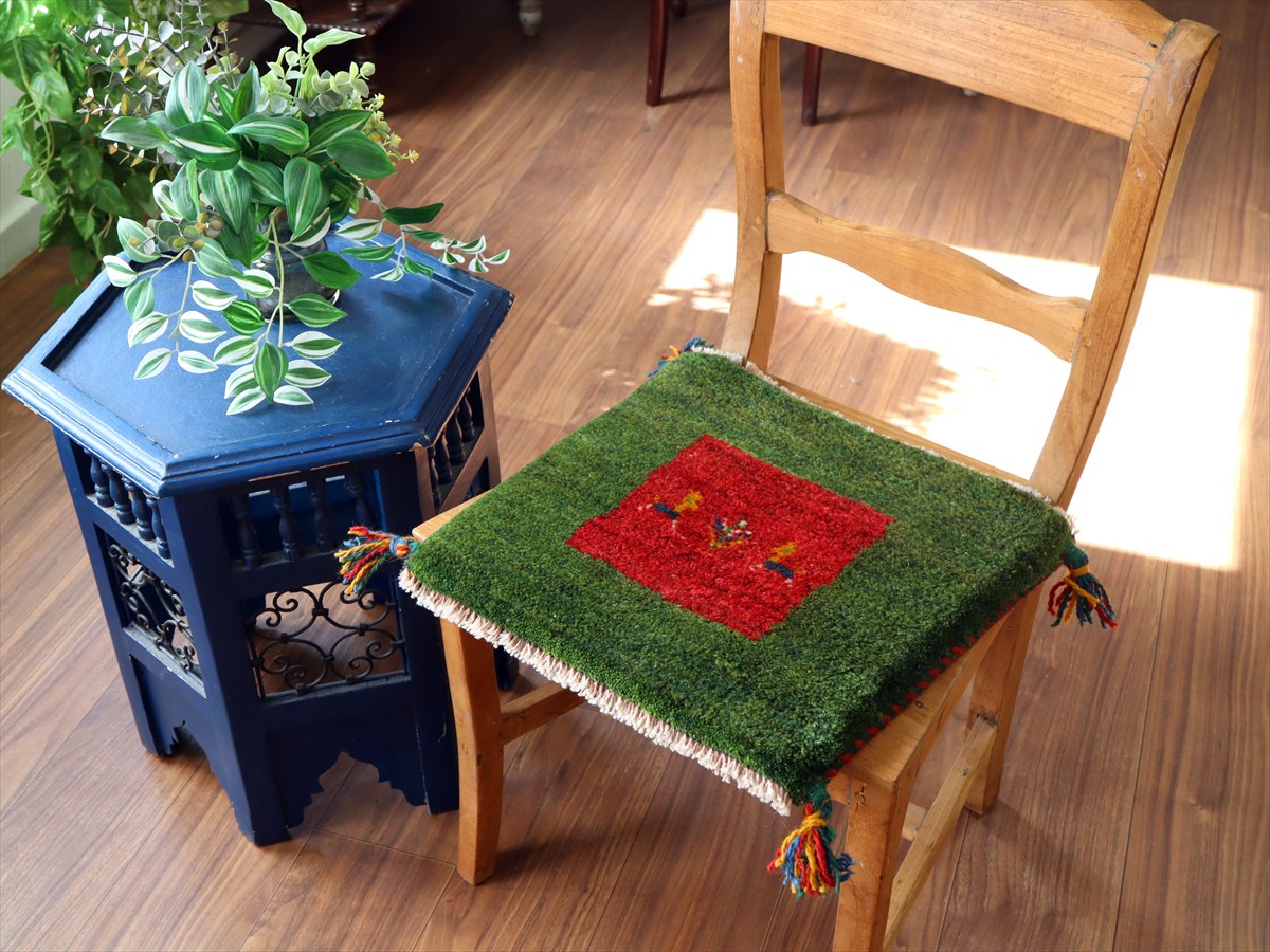 - ギャッベ イラン産手織り 座布団サイズ 38×39cm グリーン&レッド 動物と生命の樹