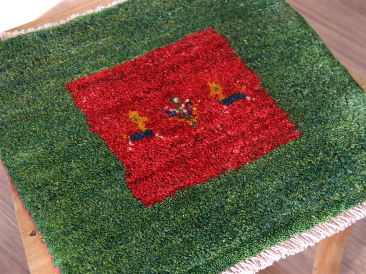 ギャッベ イラン産手織り 座布団サイズ 38×39cm グリーン&レッド 動物と生命の樹