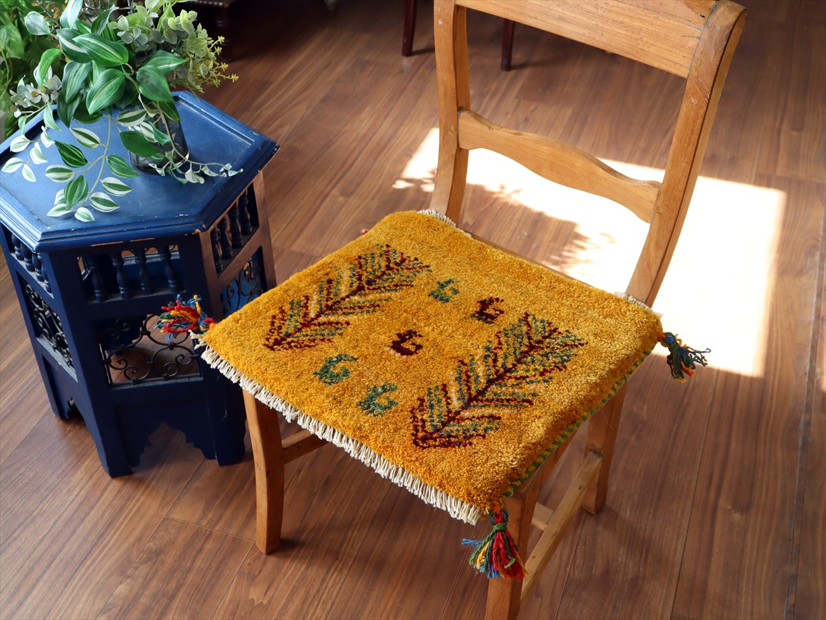 - ギャッベ イラン産手織り 座布団サイズ 39×43cm イエローオレンジ 動物と連なる生命の樹
