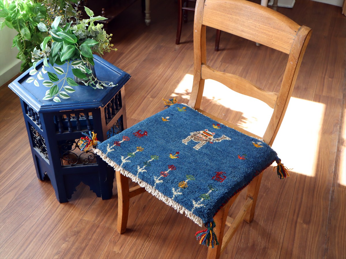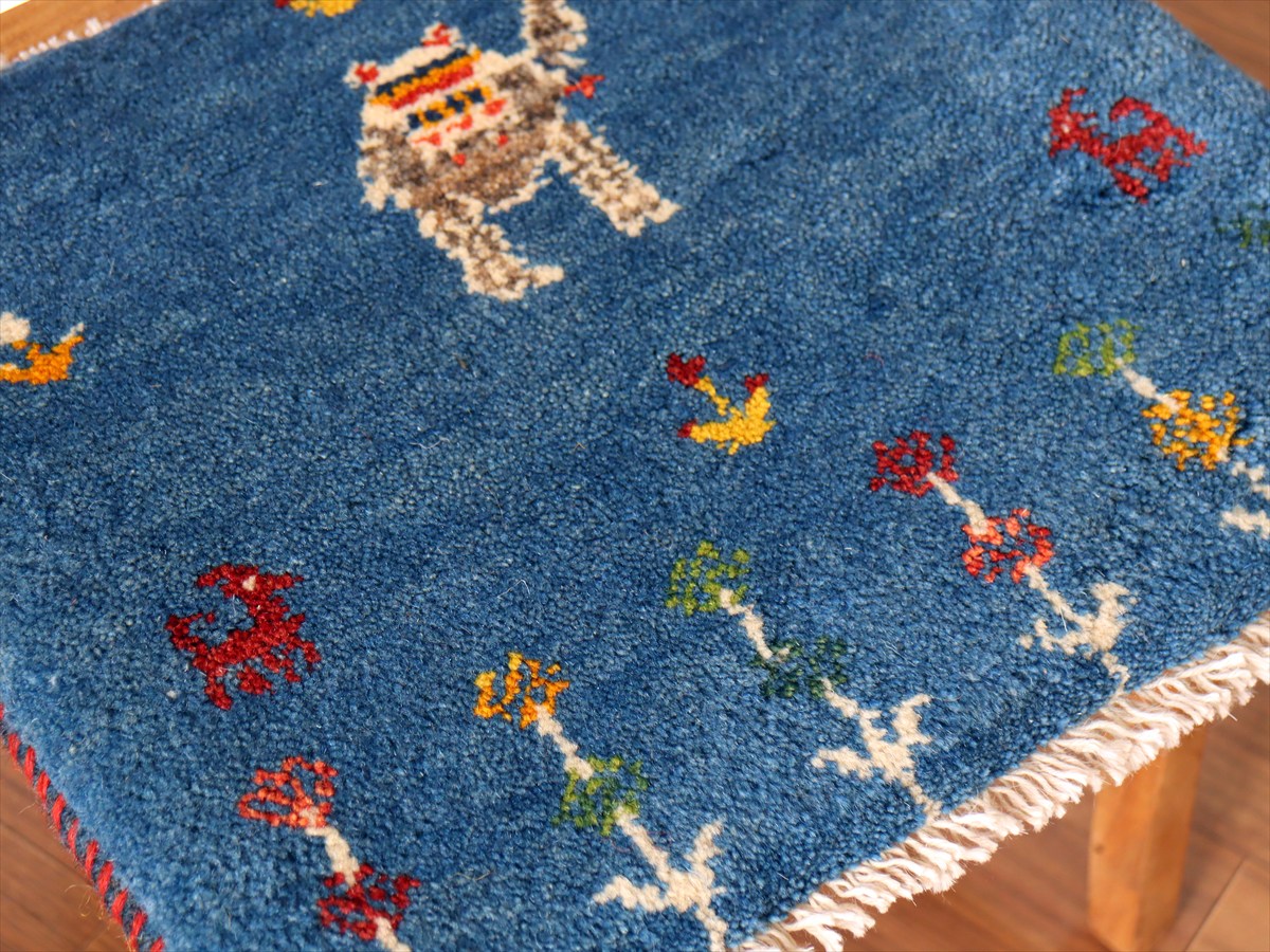 ギャッベ イラン産手織り 座布団サイズ 40×44cm ブルー ラクダと動物とフラワーデザイン