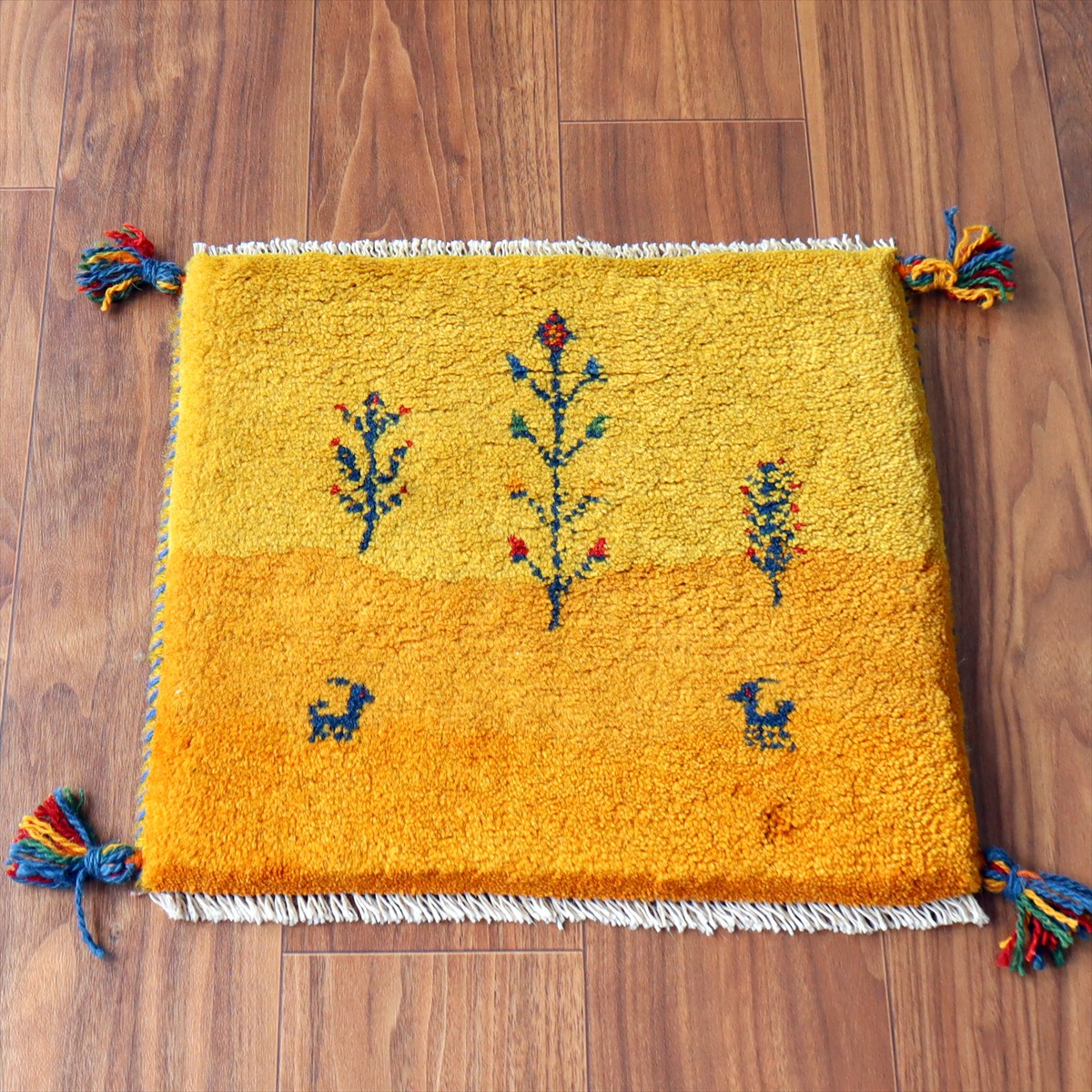 - ギャッベ イラン産手織り 座布団サイズ 38×43cm イエローオレンジ 動物と生命の樹 風景画
