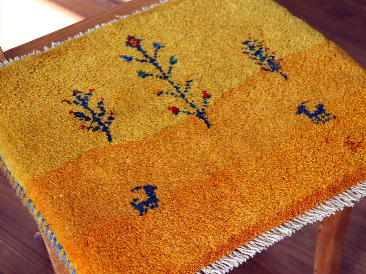 ギャッベ イラン産手織り 座布団サイズ 38×43cm イエローオレンジ 動物と生命の樹 風景画