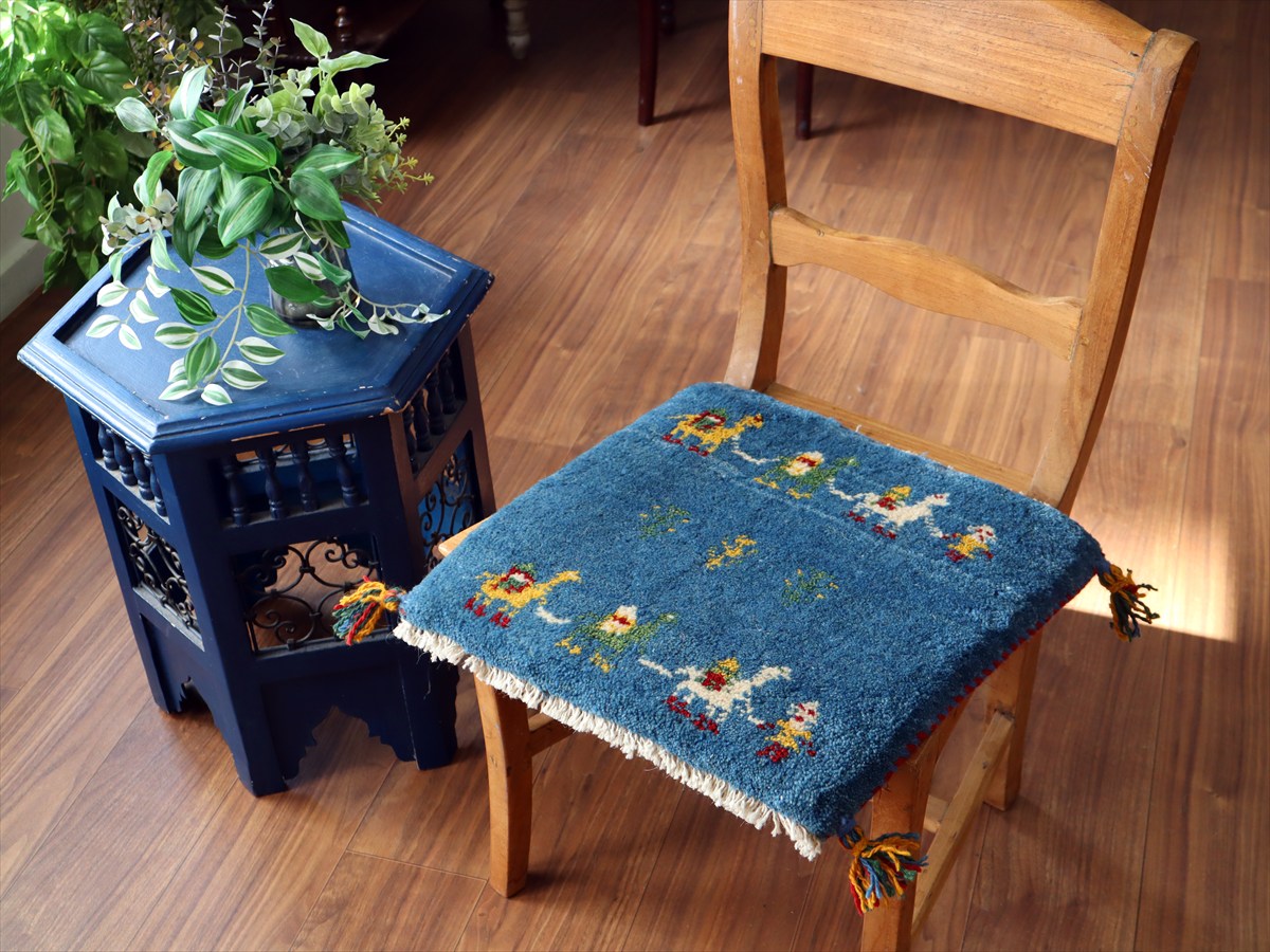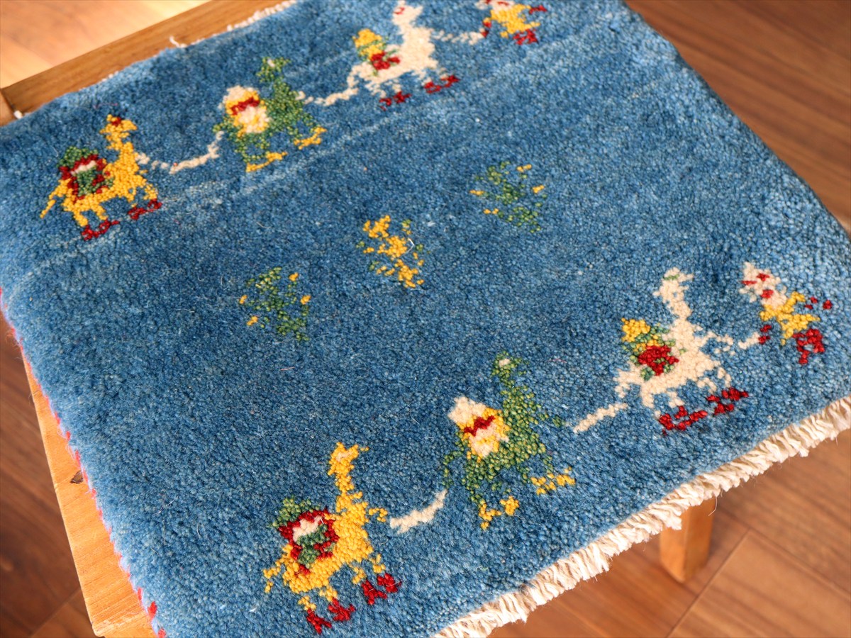 ギャッベ イラン産手織り 座布団サイズ 41×42cm ブルー ラクダのキャラバン 生命の樹