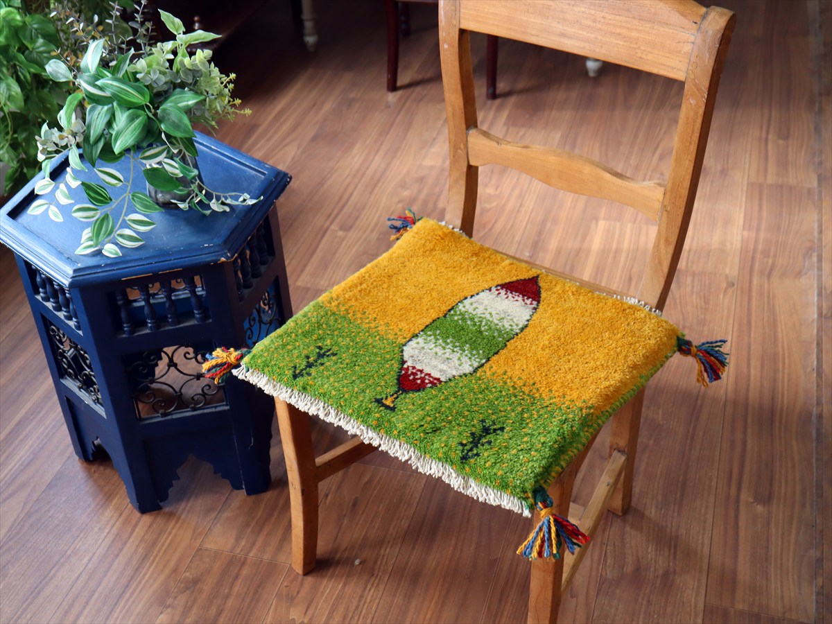 ギャッベ イラン産手織り 座布団サイズ 39×42cm イエロー&グリーン 糸杉と生命の樹