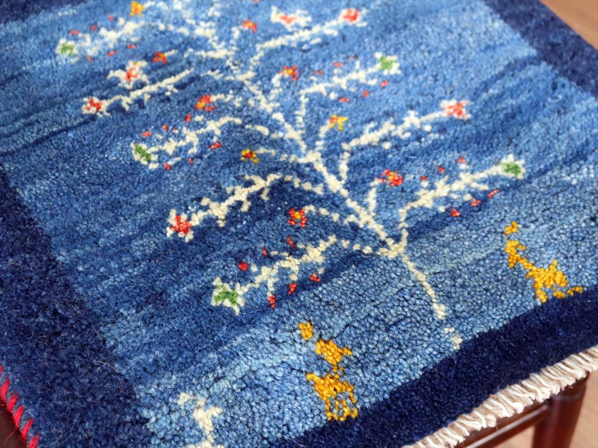 ギャッベ イラン産手織り 座布団サイズ 42×42cm ブルー 動物と生命の樹
