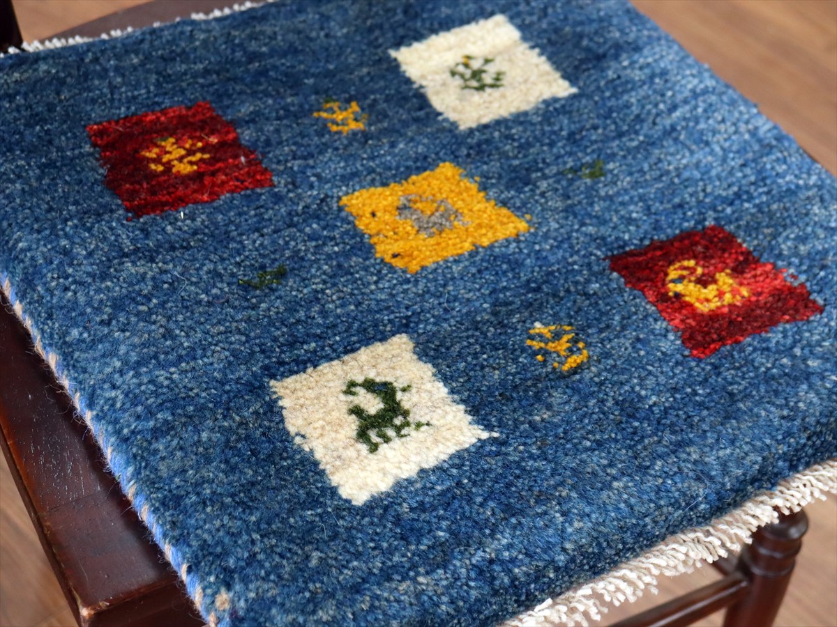 ギャッベ イラン産手織り 座布団サイズ 41×40cm ブルー カラフルタイル 動物と生命の樹