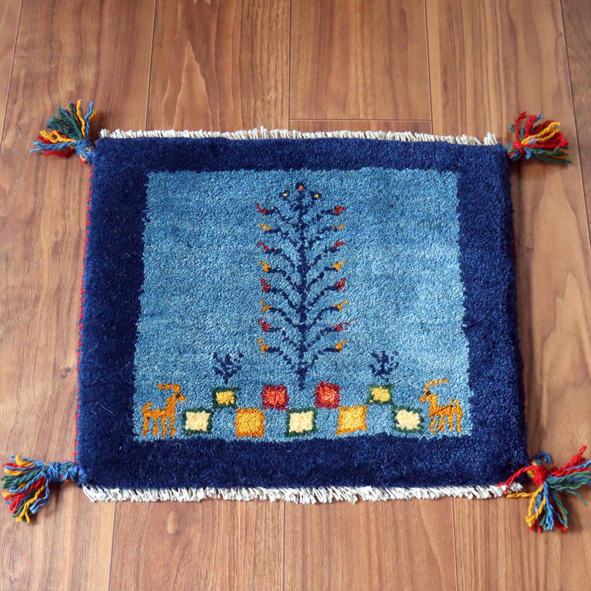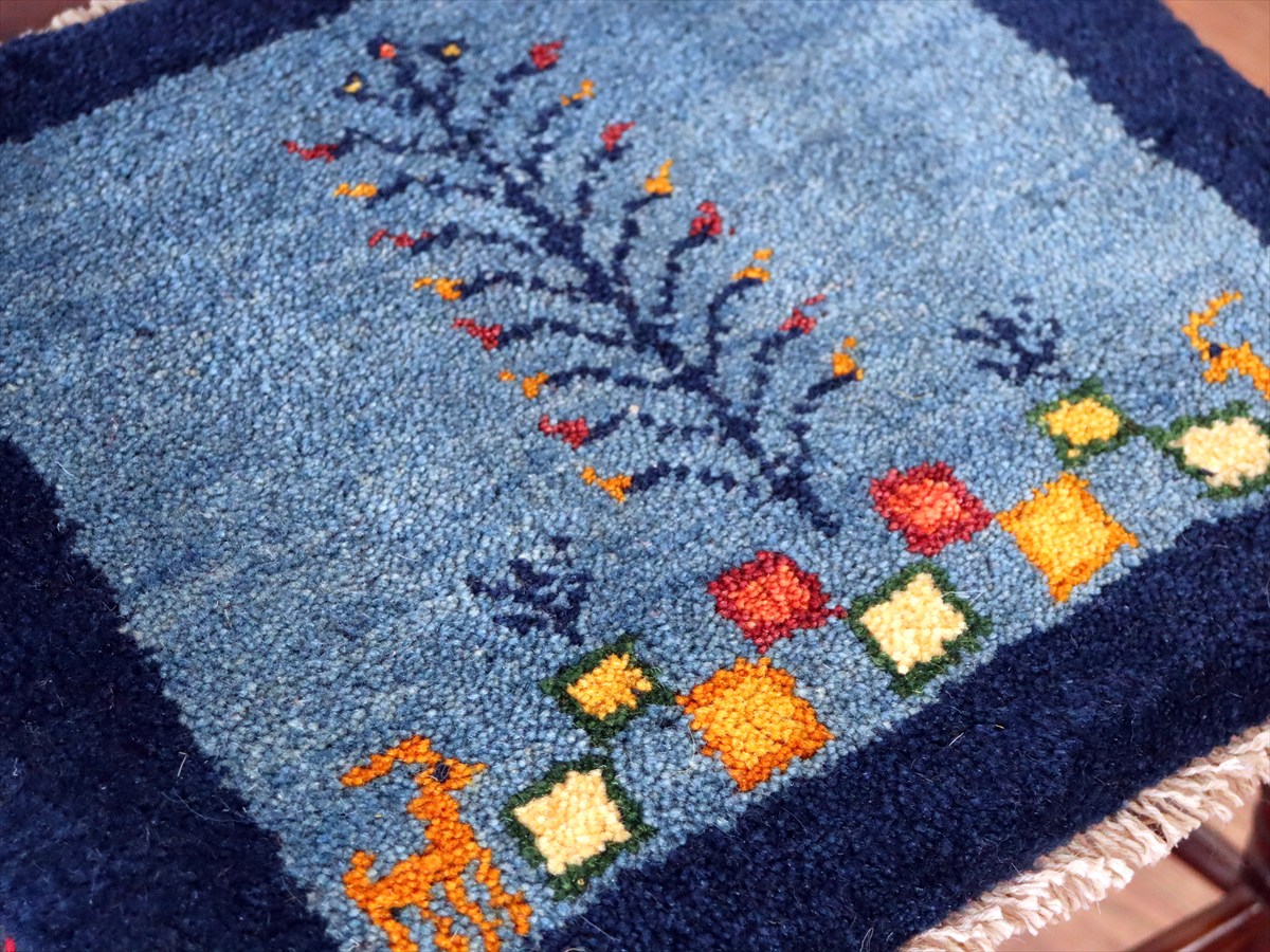 ギャッベ イラン産手織り 座布団サイズ 38×42cm ブルー 動物と生命の樹
