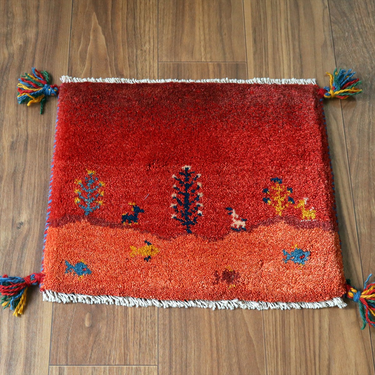 ギャッベ イラン産手織り 座布団サイズ 38×45cm レッド 生命の樹と動物 風景画