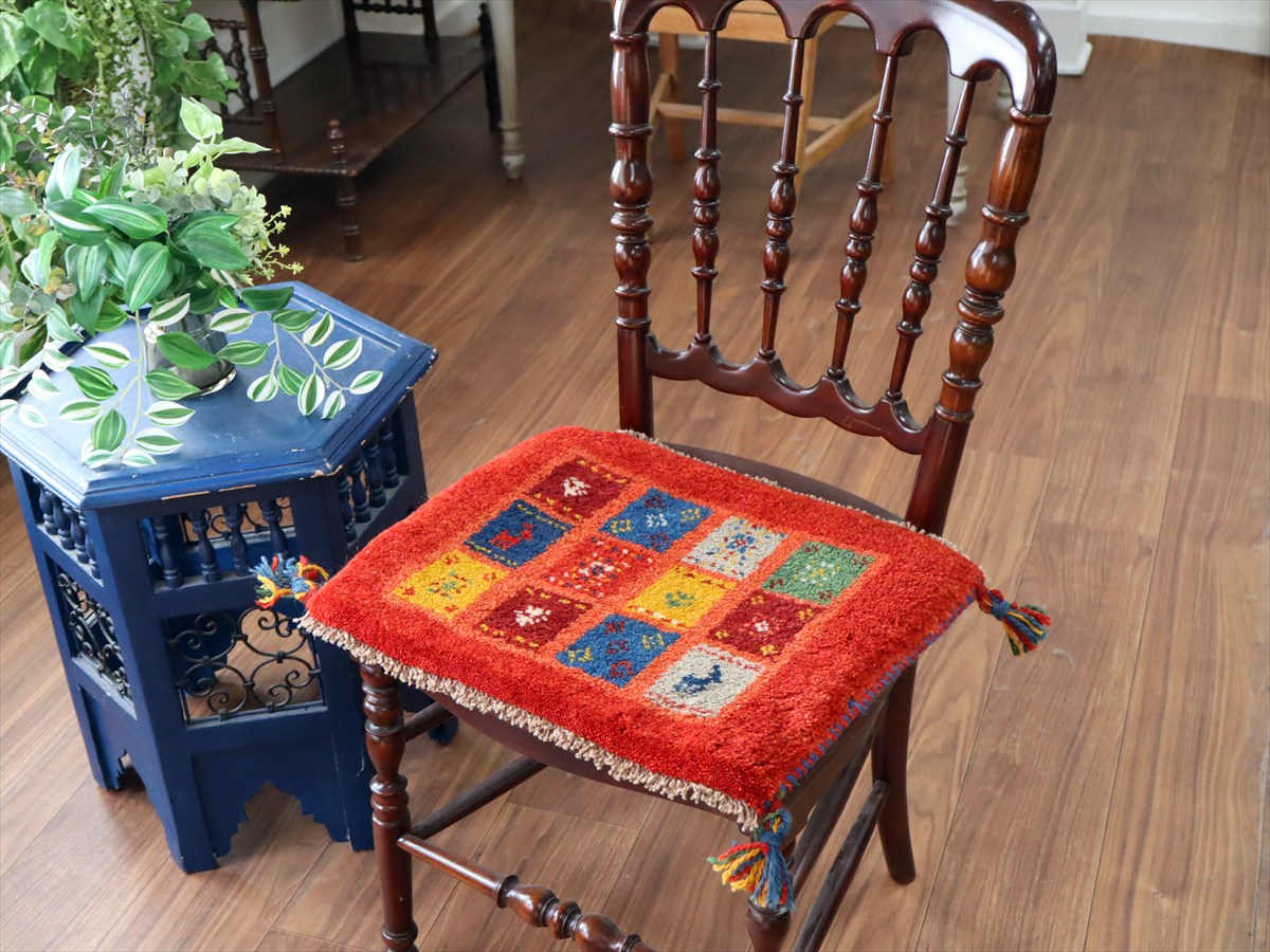 - ギャッベ イラン産手織り 座布団サイズ 36×45cm レッド カラフルタイル 生命の樹と動物